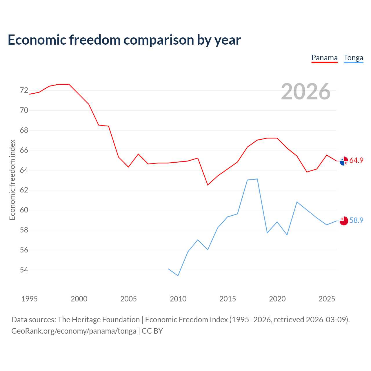 The Economic Freedom Index for Panama is 64.9, ranking 70/197, compared to 58.9 for Tonga, ranking 107/197. The chart above displays a comparison of annual changes in economic freedom indexes.