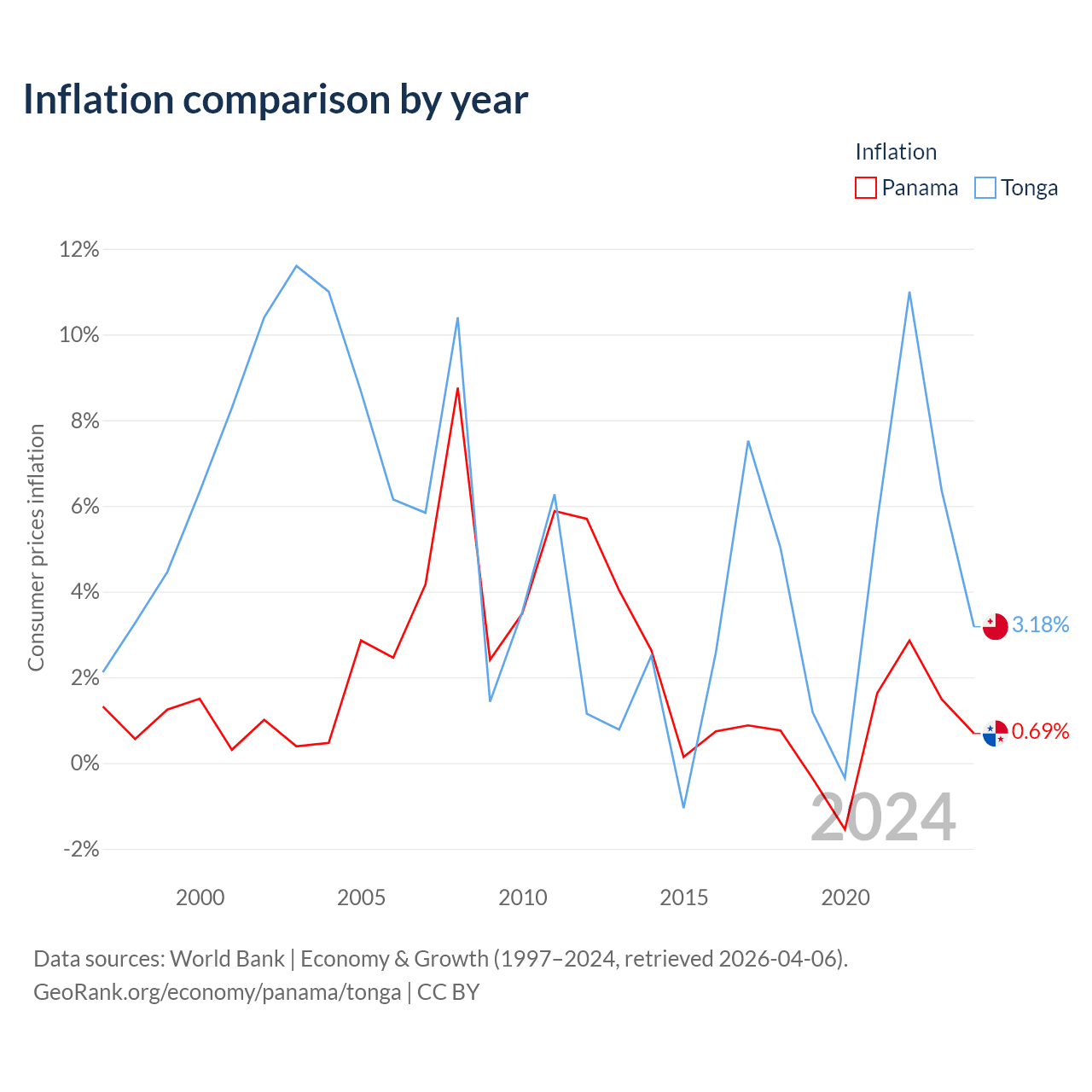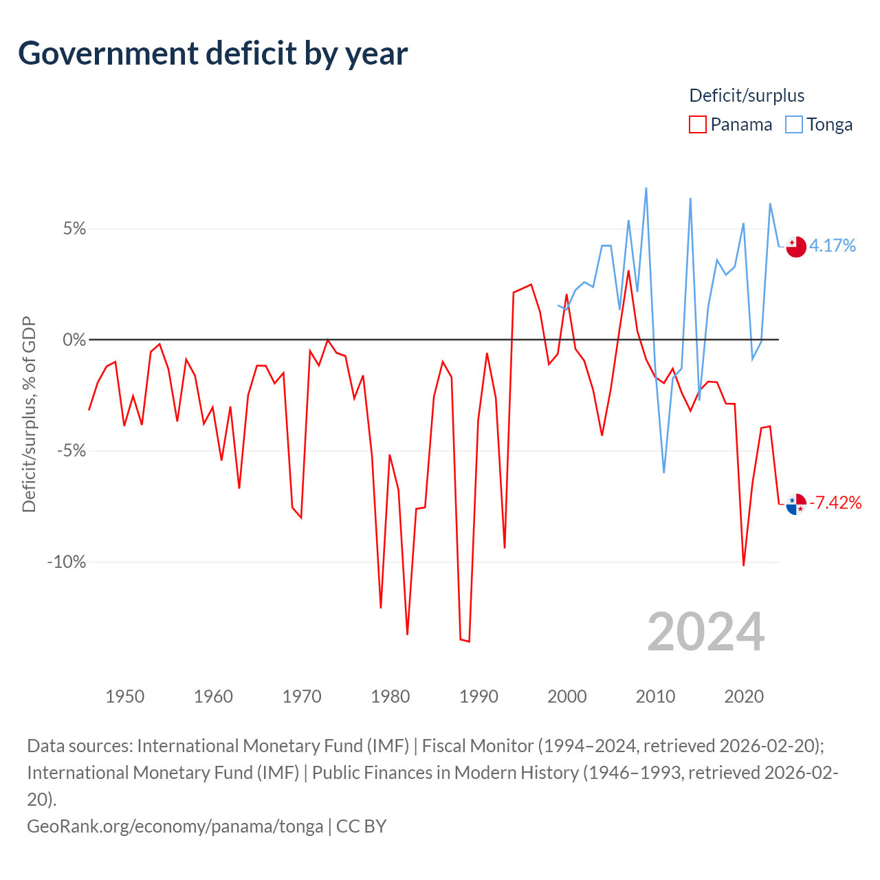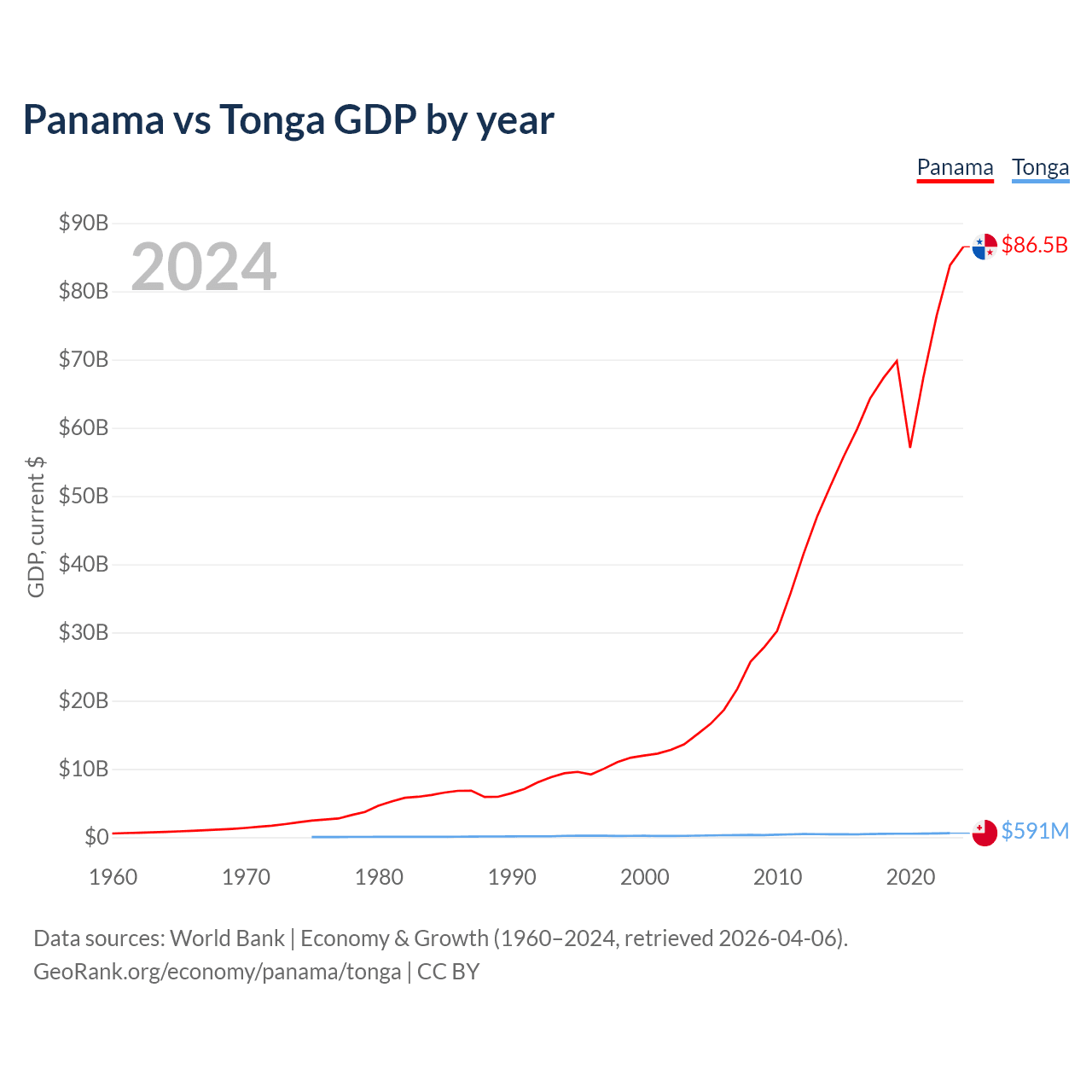 Panama has a GDP of $86.5B compared to $591M for Tonga, ranking 78/197 and 191/197 by economy size, respectively.