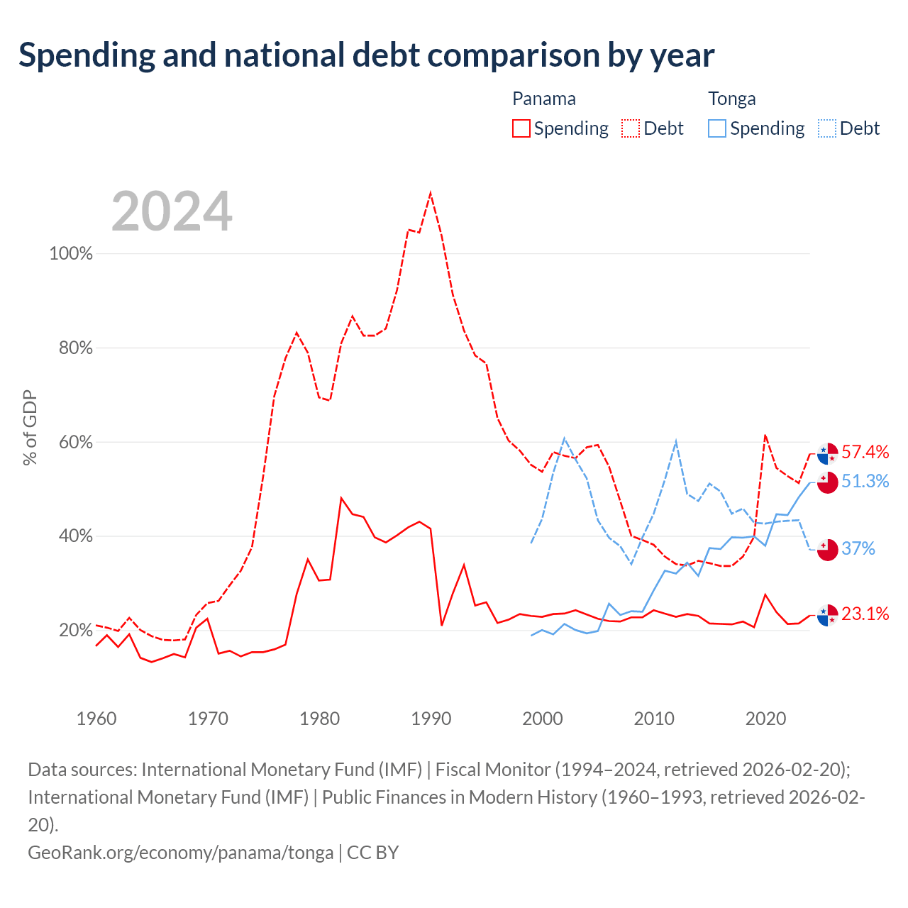 Panama has $49.6B in government debt (57.4% of GDP), compared to $256M (37% of GDP) in Tonga.