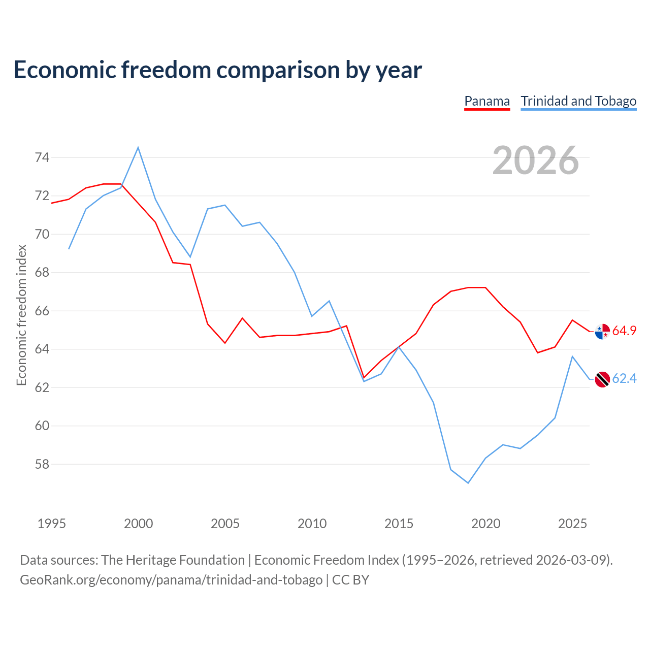 Data sources: The Heritage Foundation | Economic Freedom Index (1995–2026, retrieved 2026-03-09).