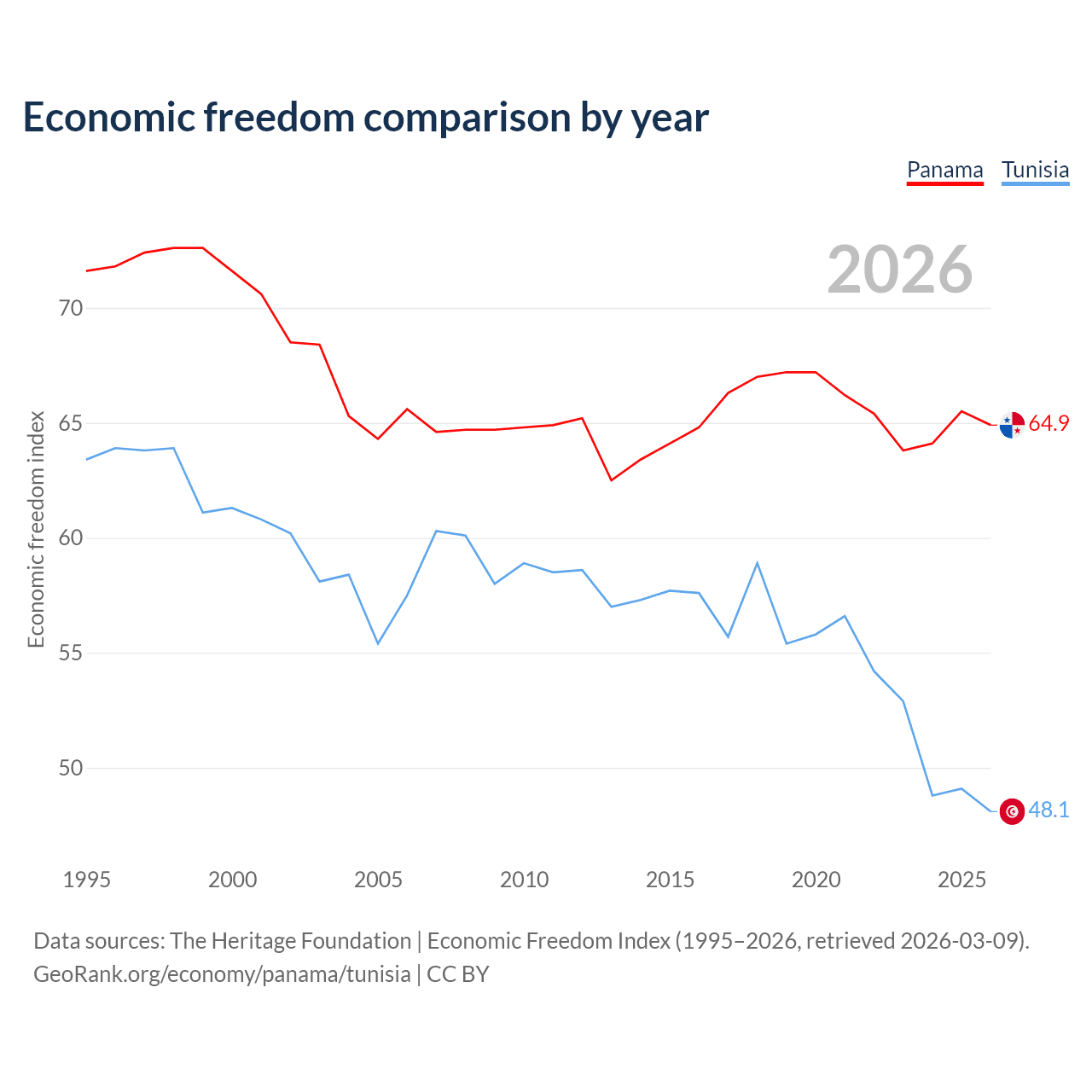 The Economic Freedom Index for Panama is 64.9, ranking 70/197, compared to 48.1 for Tunisia, ranking 172/197. The chart above displays a comparison of annual changes in economic freedom indexes.