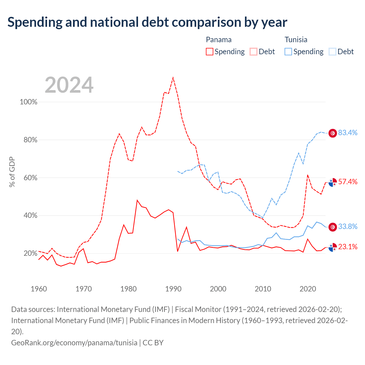 Panama has $49.6B in government debt (57.4% of GDP), compared to $42.8B (83.4% of GDP) in Tunisia.
