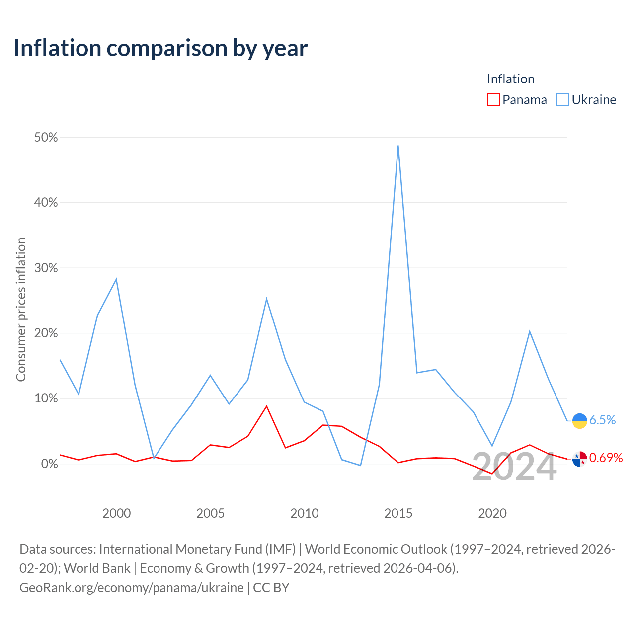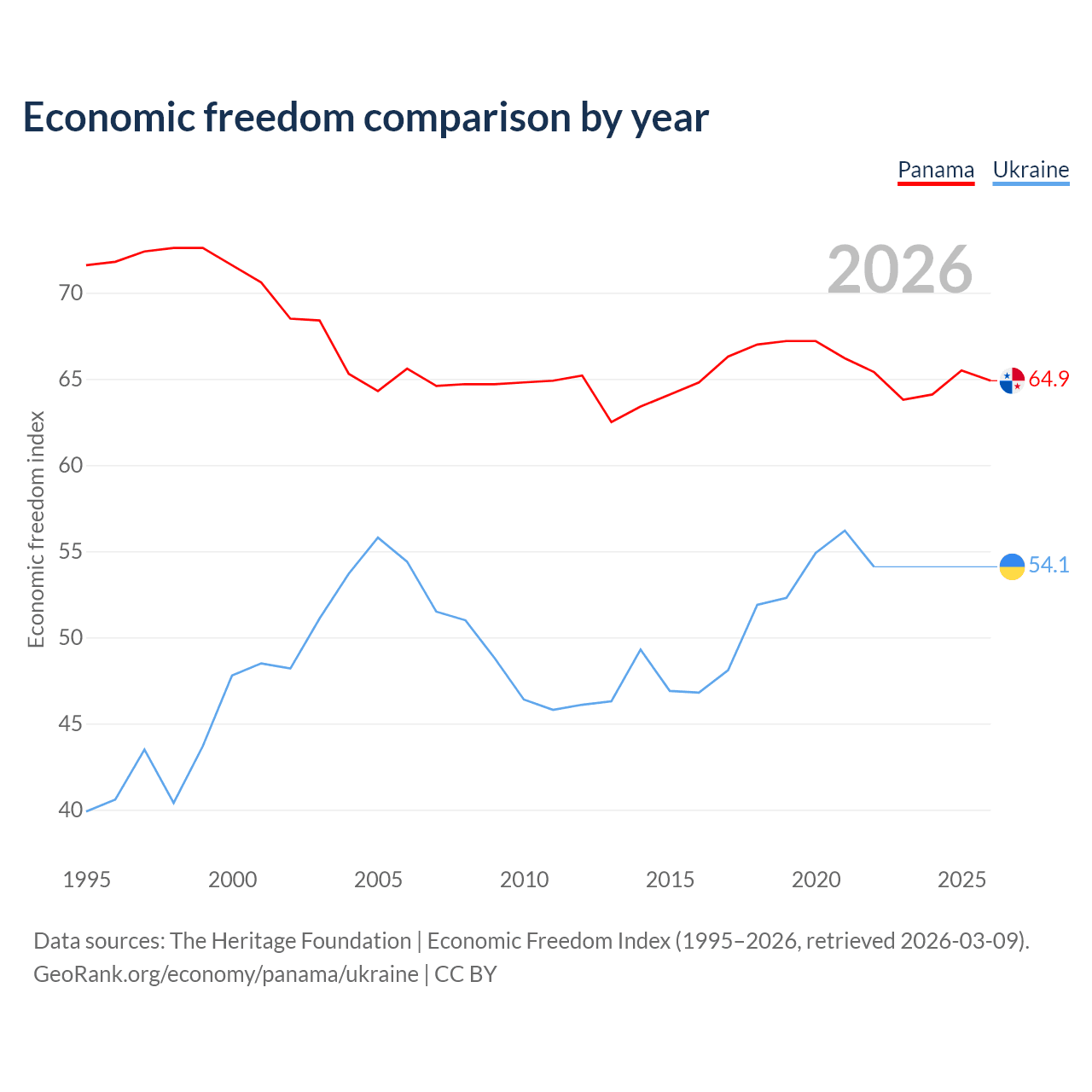 The Economic Freedom Index for Panama is 64.9, ranking 70/197, compared to 54.1 for Ukraine, ranking 135/197. The chart above displays a comparison of annual changes in economic freedom indexes.
