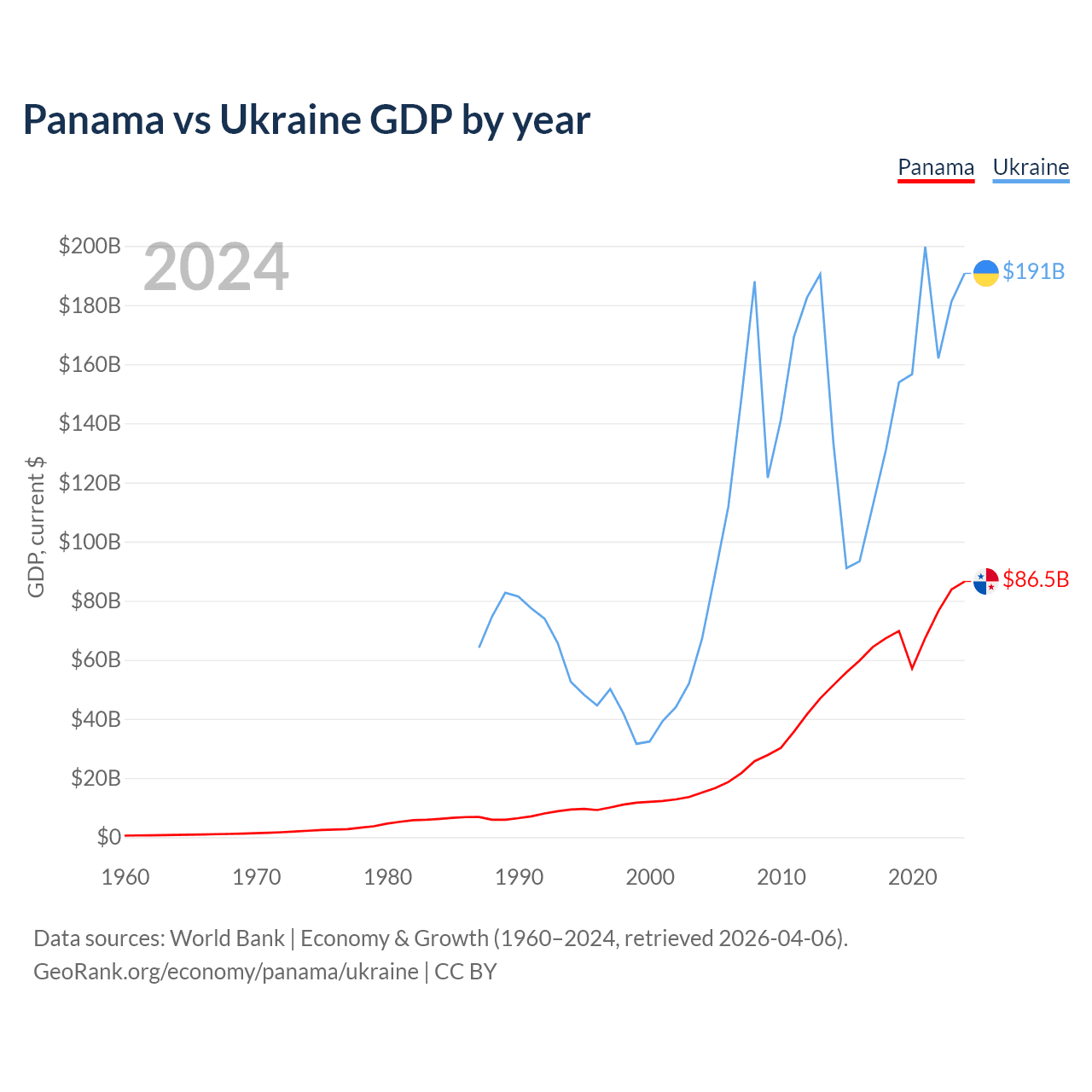 Panama has a GDP of $86.5B compared to $191B for Ukraine, ranking 78/197 and 57/197 by economy size, respectively.