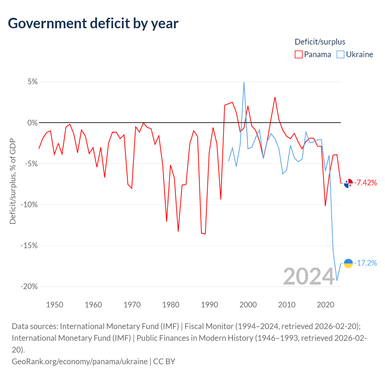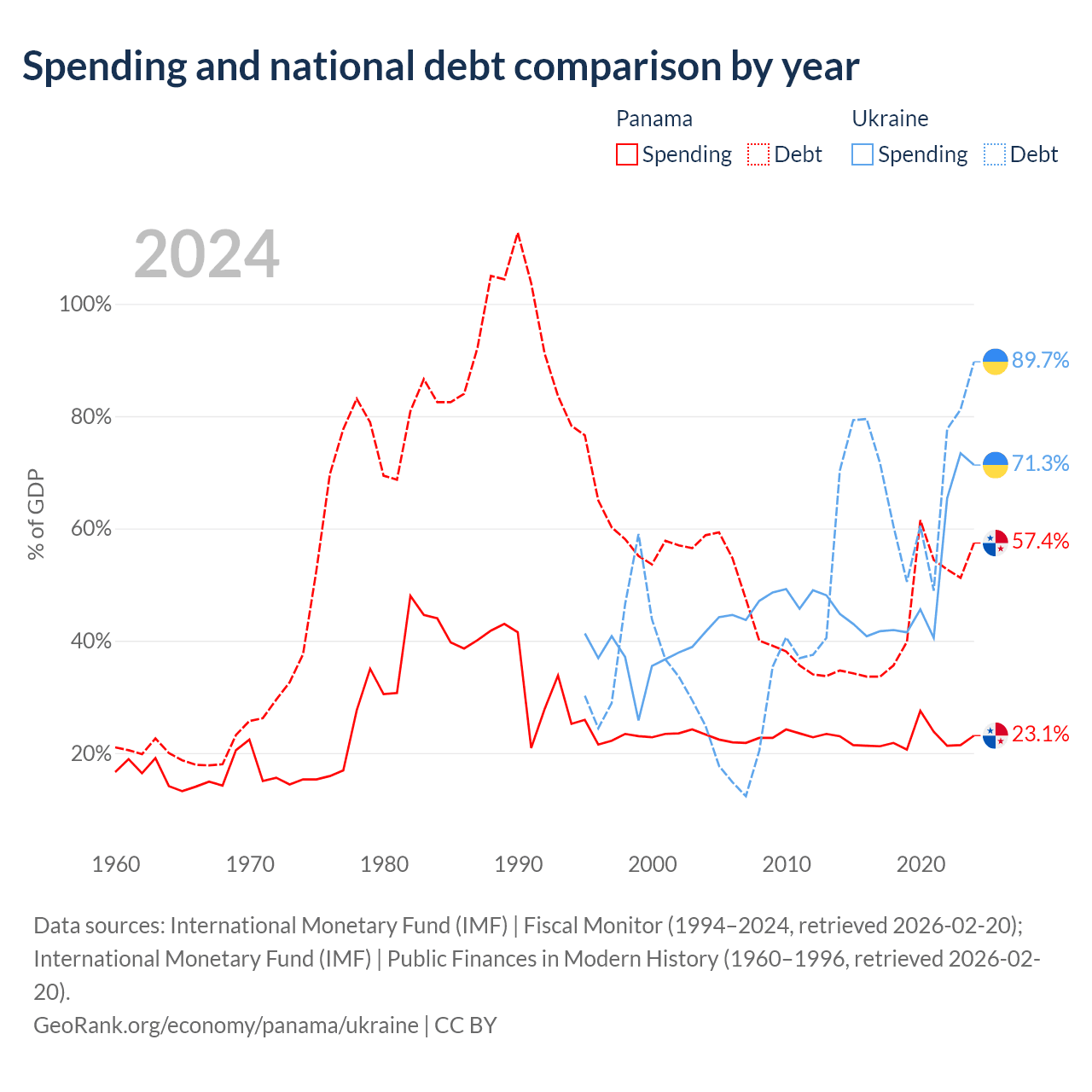 Panama has $49.6B in government debt (57.4% of GDP), compared to $171B (89.7% of GDP) in Ukraine.