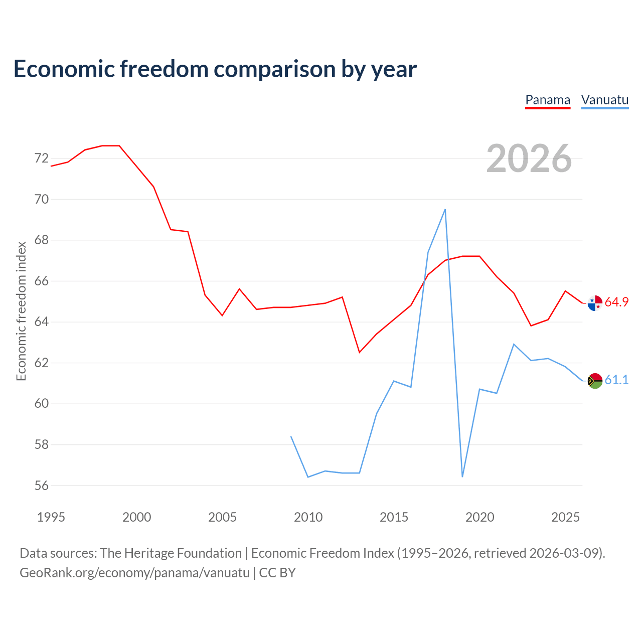 The Economic Freedom Index for Panama is 64.9, ranking 70/197, compared to 61.1 for Vanuatu, ranking 92/197. The chart above displays a comparison of annual changes in economic freedom indexes.