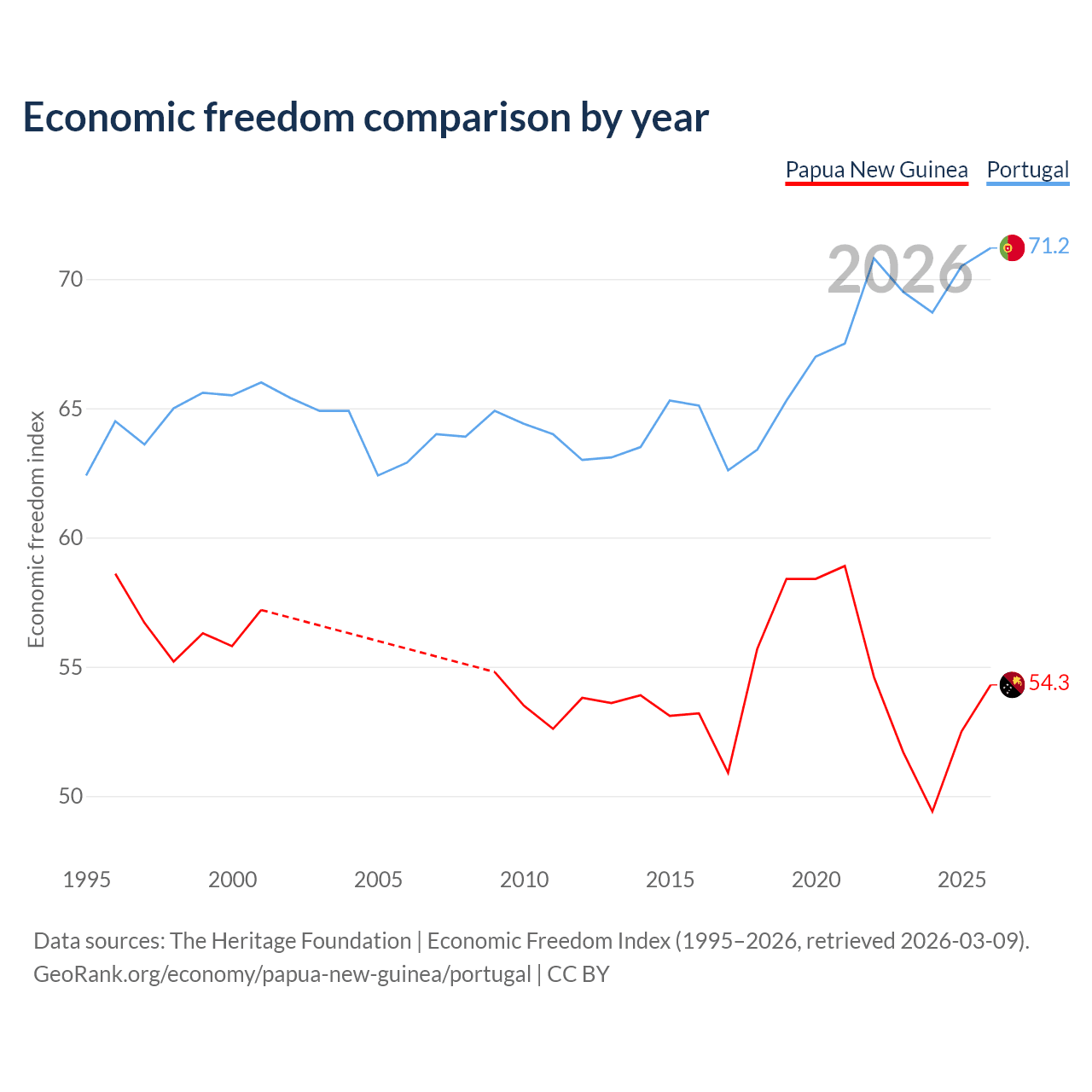 The Economic Freedom Index for Papua New Guinea is 54.3, ranking 134/197, compared to 71.2 for Portugal, ranking 33/197. The chart above displays a comparison of annual changes in economic freedom indexes.