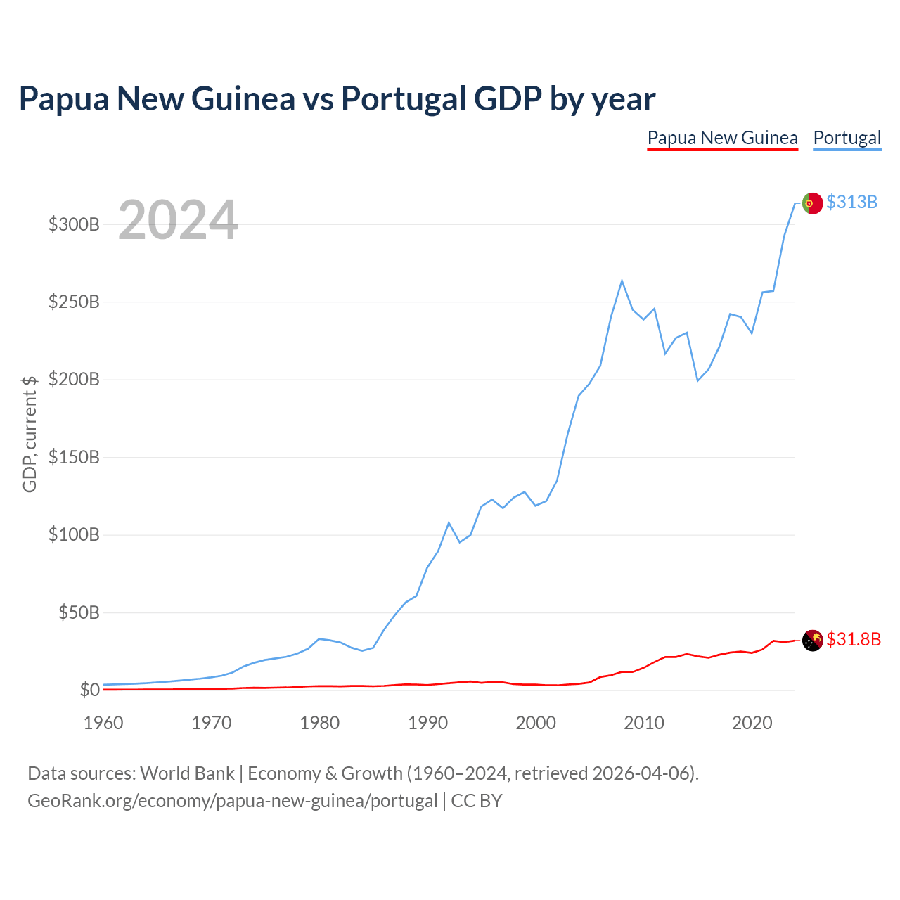 Papua New Guinea has a GDP of $31.8B compared to $313B for Portugal, ranking 110/197 and 46/197 by economy size, respectively.