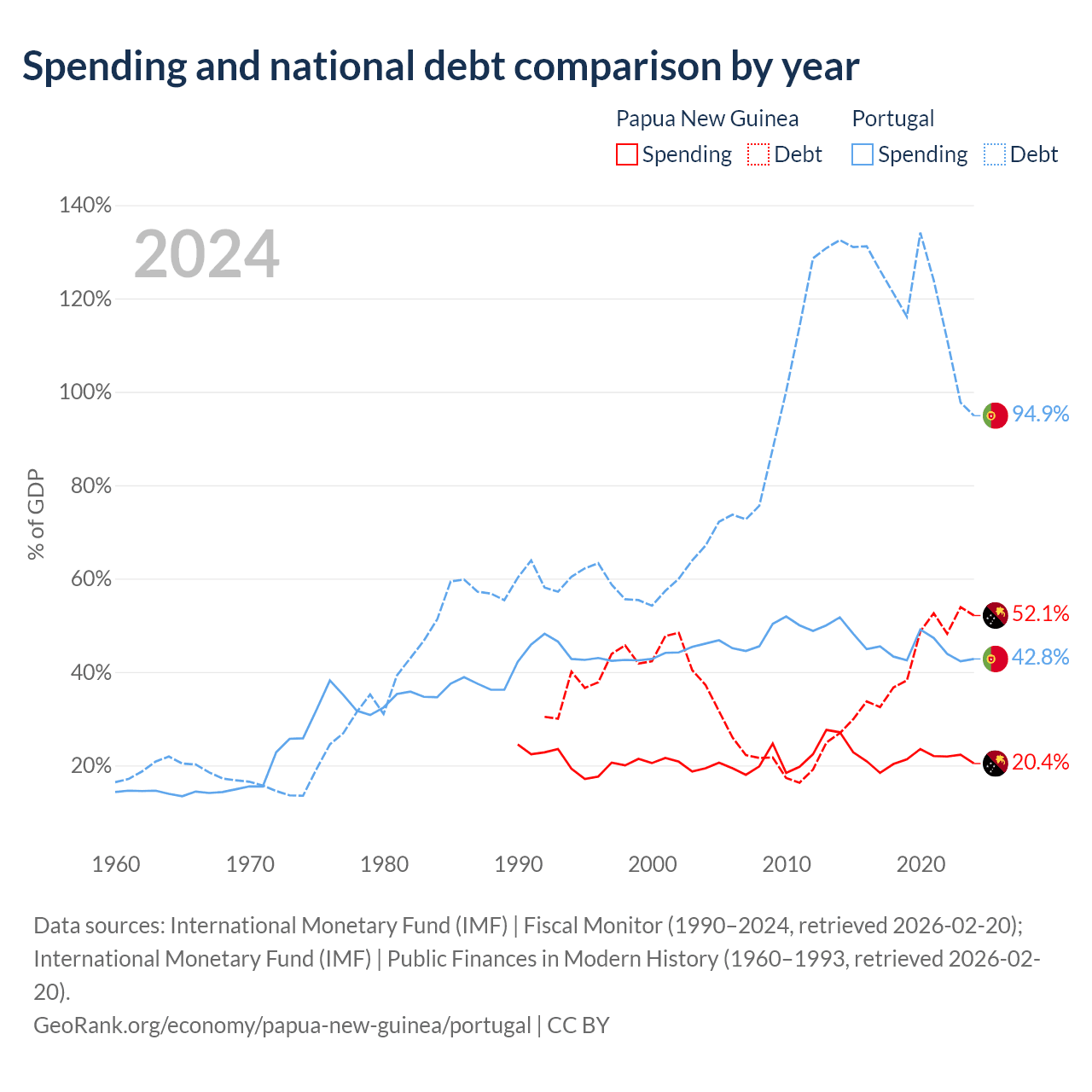 Papua New Guinea has $16.6B in government debt (52.1% of GDP), compared to $297B (94.9% of GDP) in Portugal.