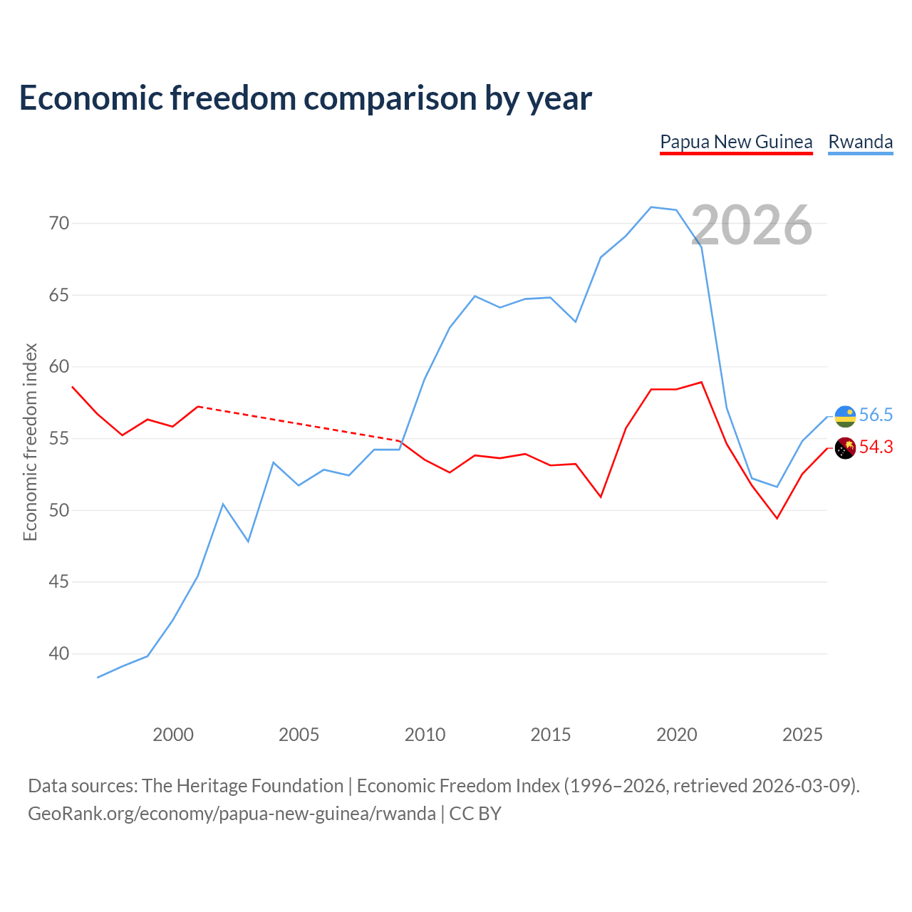 The Economic Freedom Index for Papua New Guinea is 54.3, ranking 134/197, compared to 56.5 for Rwanda, ranking 121/197. The chart above displays a comparison of annual changes in economic freedom indexes.