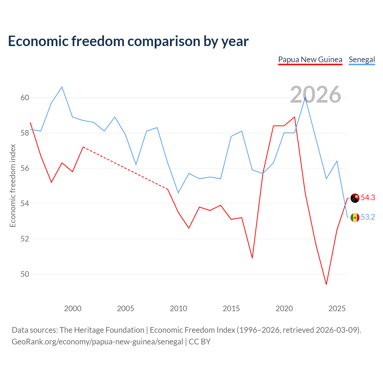 The Economic Freedom Index for Papua New Guinea is 54.3, ranking 134/197, compared to 53.2 for Senegal, ranking 140/197. The chart above displays a comparison of annual changes in economic freedom indexes.