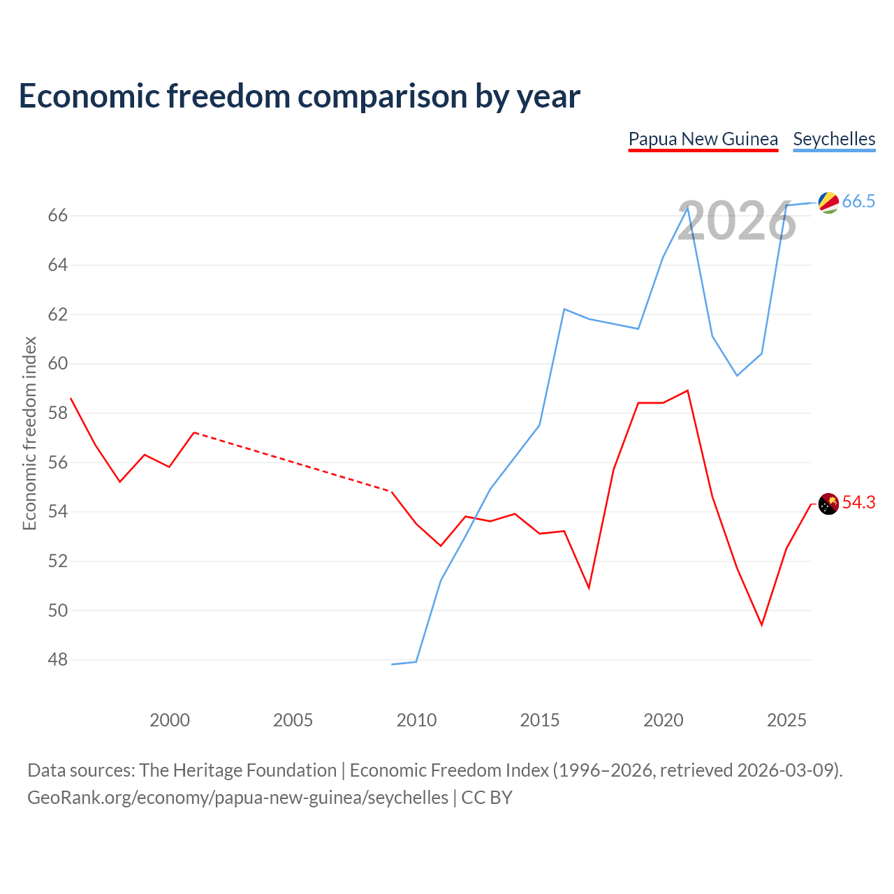 The Economic Freedom Index for Papua New Guinea is 54.3, ranking 134/197, compared to 66.5 for the Seychelles, ranking 60/197. The chart above displays a comparison of annual changes in economic freedom indexes.