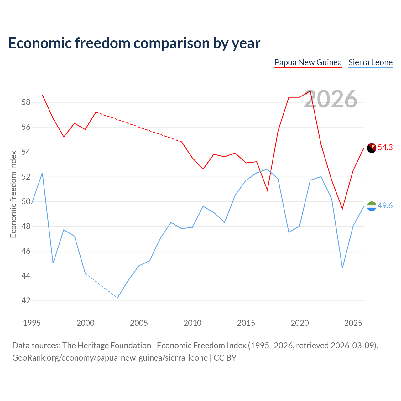 The Economic Freedom Index for Papua New Guinea is 54.3, ranking 134/197, compared to 49.6 for Sierra Leone, ranking 165/197. The chart above displays a comparison of annual changes in economic freedom indexes.