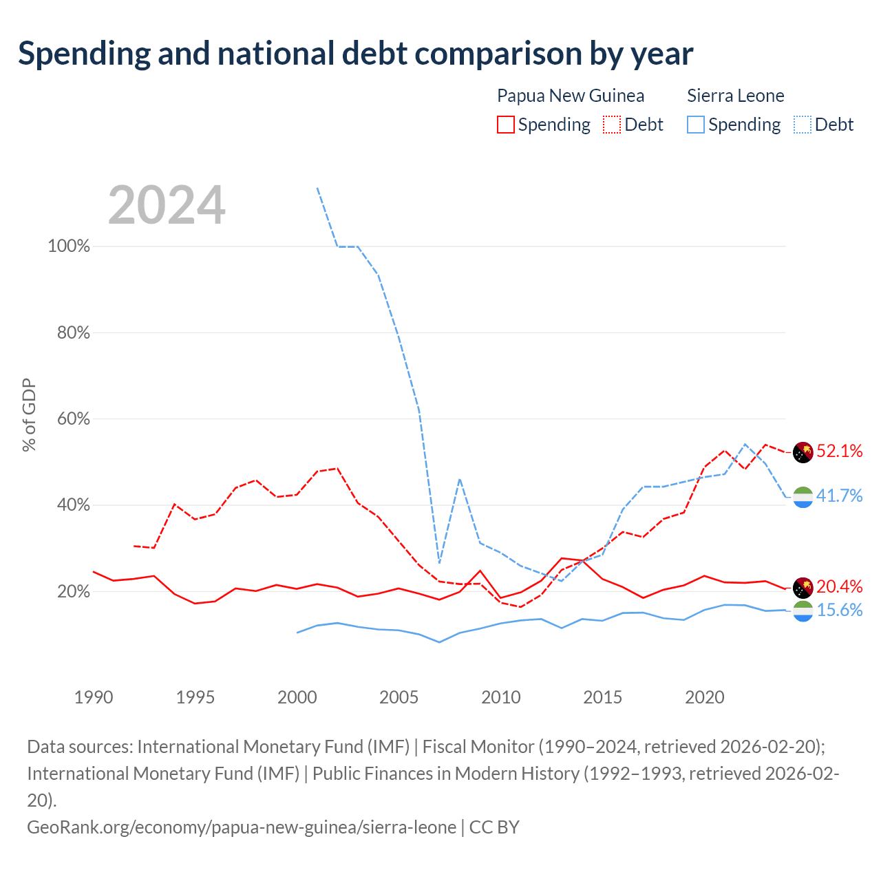 Papua New Guinea has $16.6B in government debt (52.1% of GDP), compared to $2.91B (41.7% of GDP) in Sierra Leone.