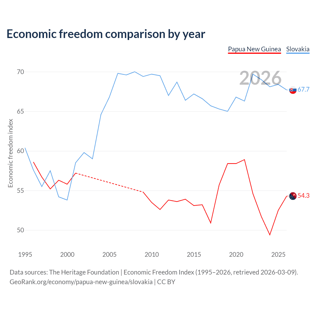 The Economic Freedom Index for Papua New Guinea is 54.3, ranking 134/197, compared to 67.7 for Slovakia, ranking 54/197. The chart above displays a comparison of annual changes in economic freedom indexes.