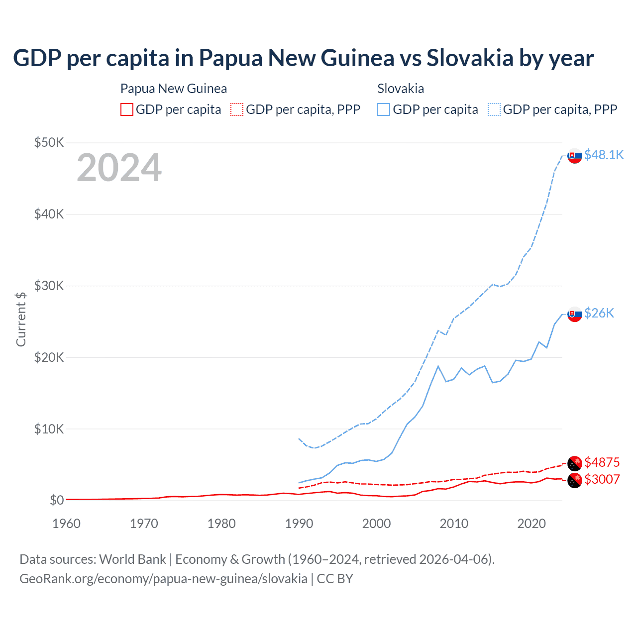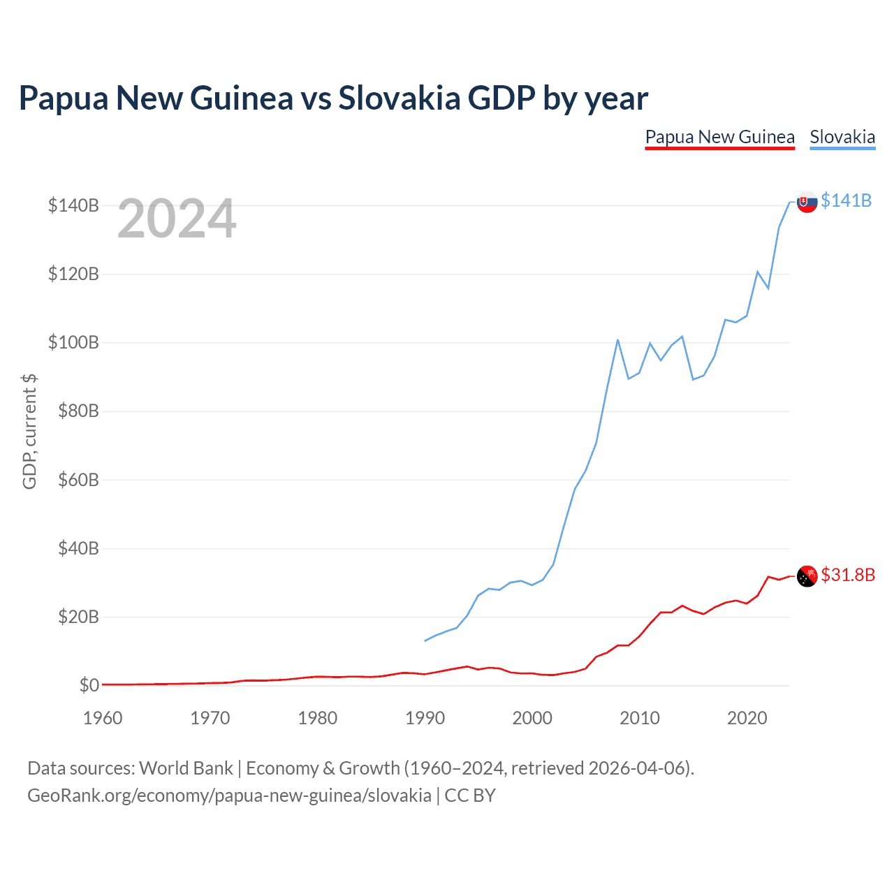 Papua New Guinea has a GDP of $31.8B compared to $141B for Slovakia, ranking 110/197 and 61/197 by economy size, respectively.