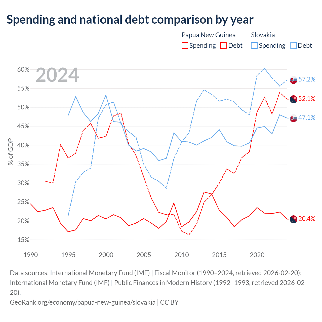 Papua New Guinea has $16.6B in government debt (52.1% of GDP), compared to $80.7B (57.2% of GDP) in Slovakia.