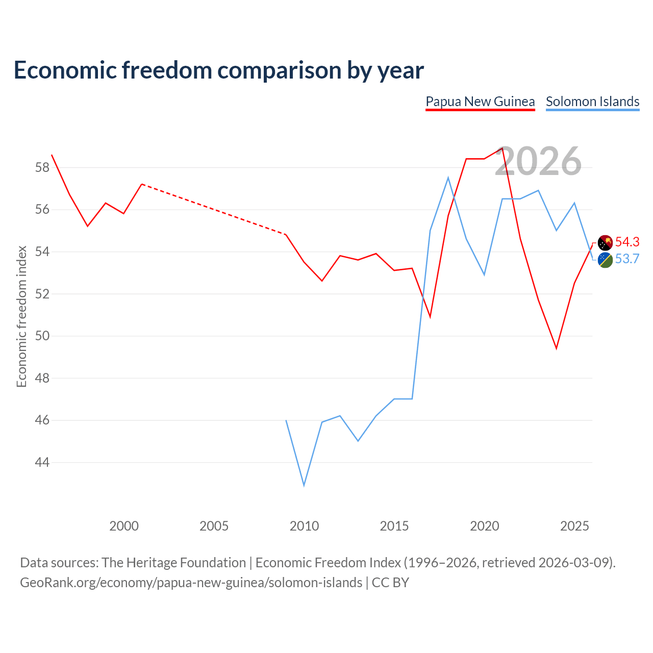 The Economic Freedom Index for Papua New Guinea is 54.3, ranking 134/197, compared to 53.7 for the Solomon Islands, ranking 137/197. The chart above displays a comparison of annual changes in economic freedom indexes.