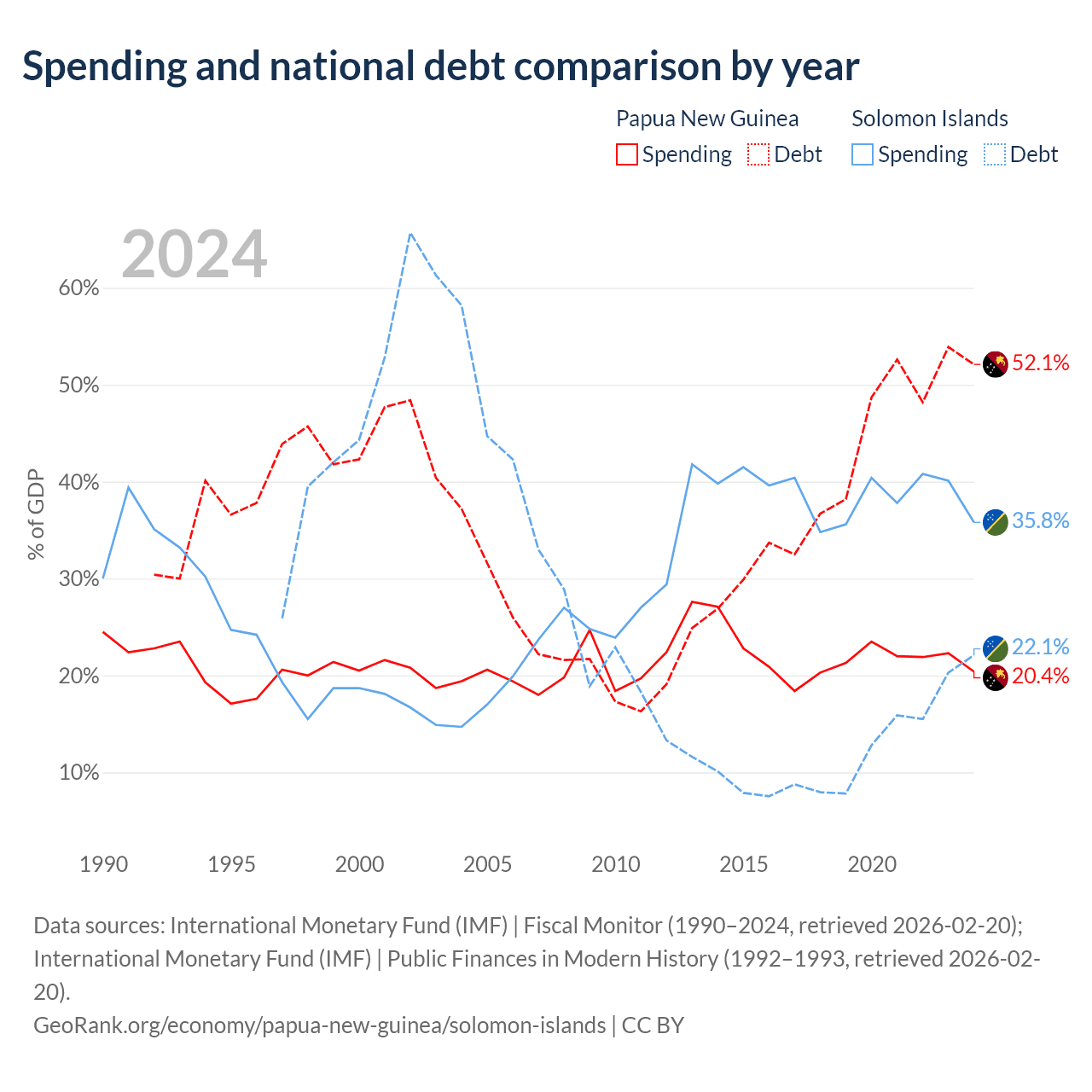 Papua New Guinea has $16.6B in government debt (52.1% of GDP), compared to $350M (22.1% of GDP) in the Solomon Islands.