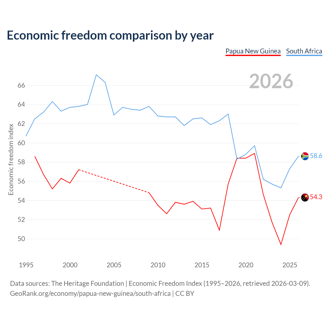 The Economic Freedom Index for Papua New Guinea is 54.3, ranking 134/197, compared to 58.6 for South Africa, ranking 110/197. The chart above displays a comparison of annual changes in economic freedom indexes.