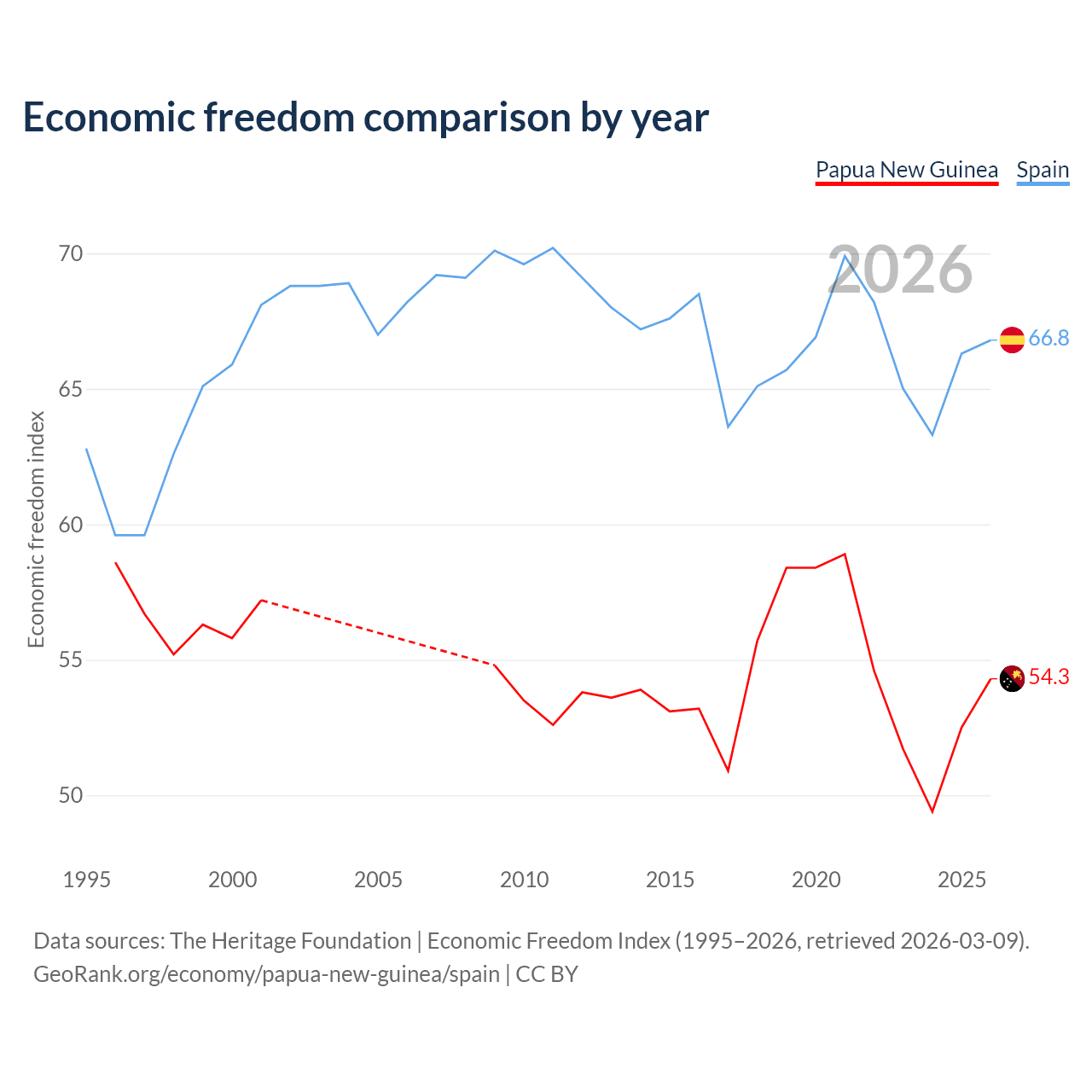 The Economic Freedom Index for Papua New Guinea is 54.3, ranking 134/197, compared to 66.8 for Spain, ranking 59/197. The chart above displays a comparison of annual changes in economic freedom indexes.