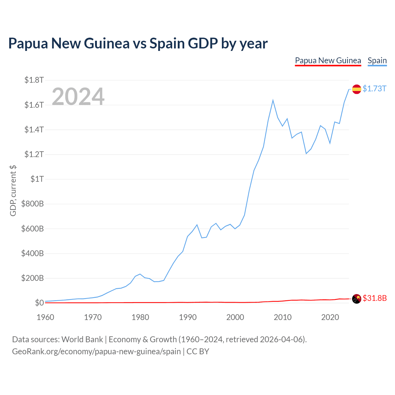 Papua New Guinea has a GDP of $31.8B compared to $1.73T for Spain, ranking 110/197 and 15/197 by economy size, respectively.