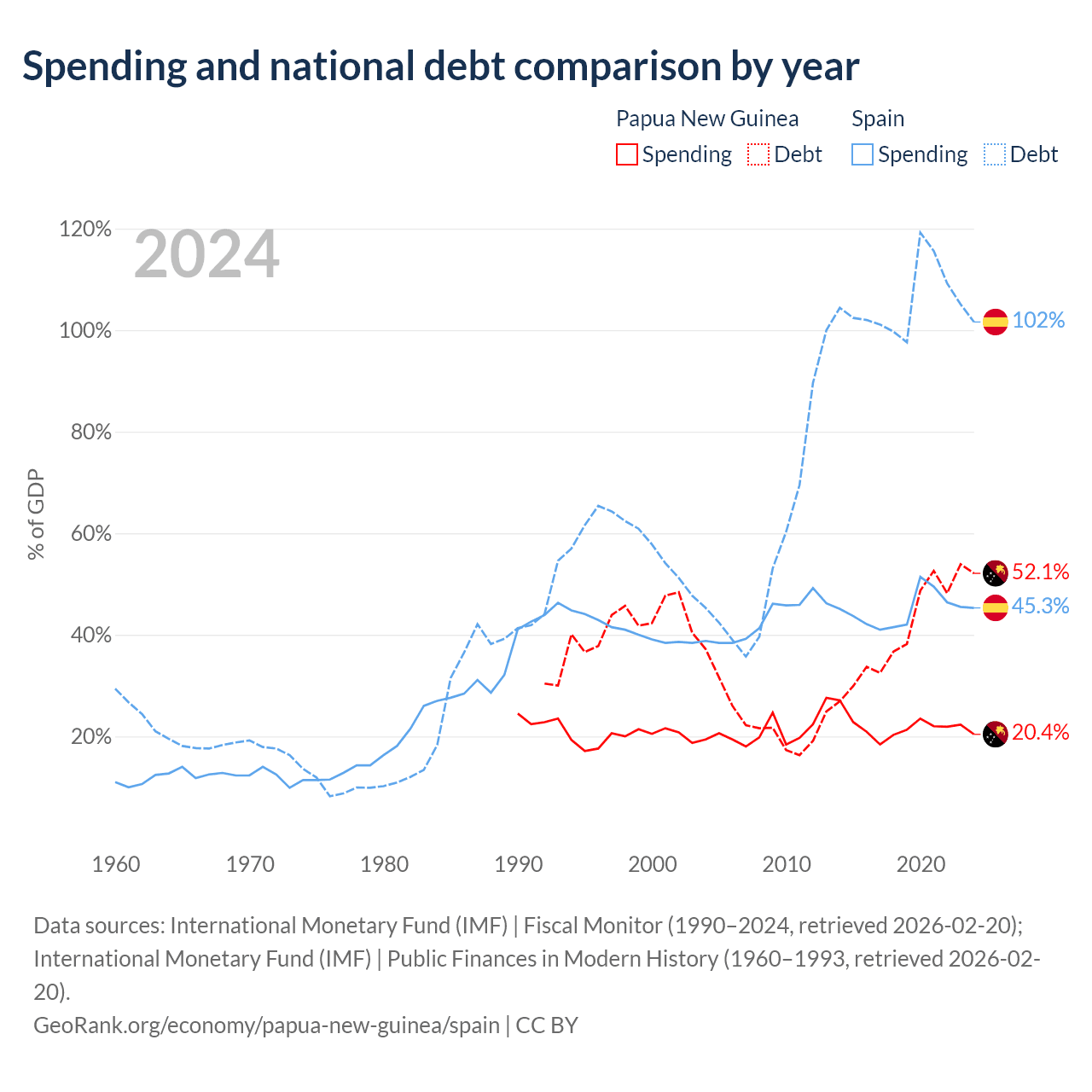 Papua New Guinea has $16.6B in government debt (52.1% of GDP), compared to $1.75T (101.6% of GDP) in Spain.