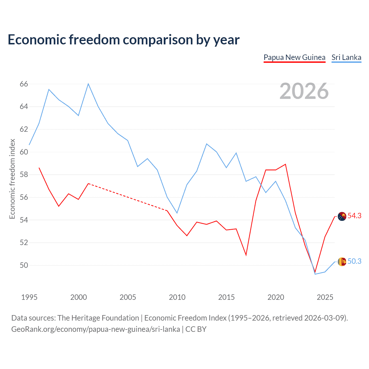 The Economic Freedom Index for Papua New Guinea is 54.3, ranking 134/197, compared to 50.3 for Sri Lanka, ranking 162/197. The chart above displays a comparison of annual changes in economic freedom indexes.