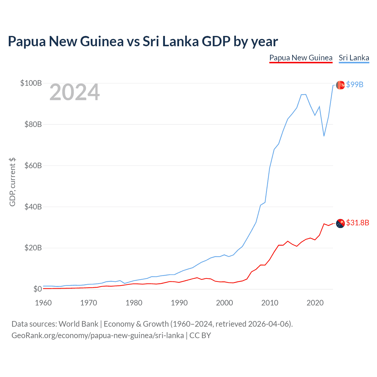 Papua New Guinea has a GDP of $31.8B compared to $99B for Sri Lanka, ranking 110/197 and 72/197 by economy size, respectively.
