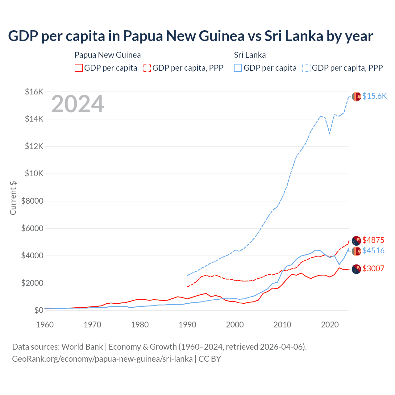 GDP per capita in Papua New Guinea vs Sri Lanka by year