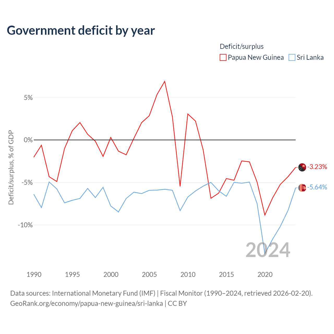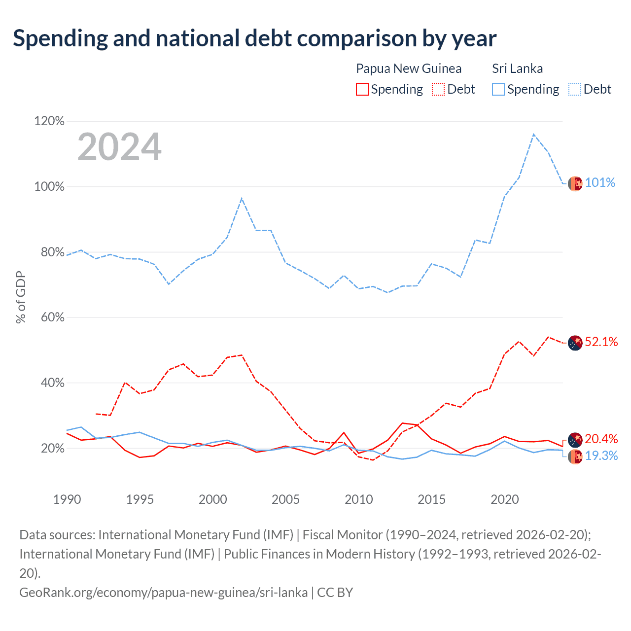 Papua New Guinea has $16.6B in government debt (52.1% of GDP), compared to $99.8B (100.8% of GDP) in Sri Lanka.