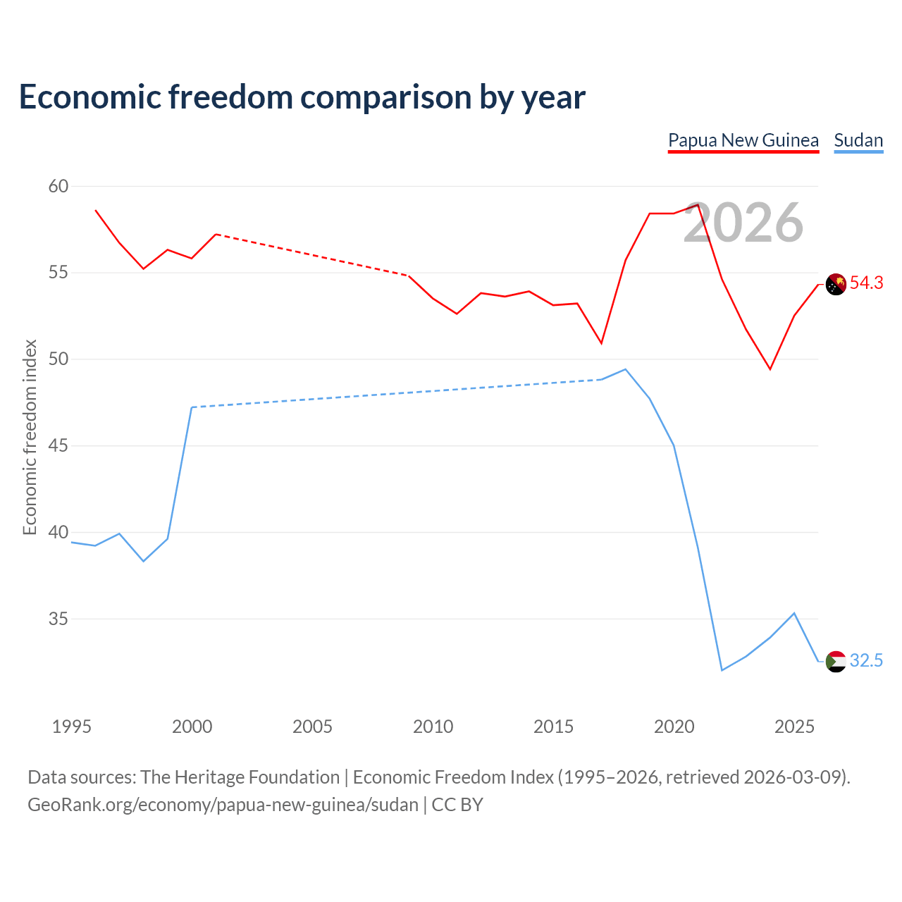 The Economic Freedom Index for Papua New Guinea is 54.3, ranking 134/197, compared to 32.5 for Sudan, ranking 191/197. The chart above displays a comparison of annual changes in economic freedom indexes.
