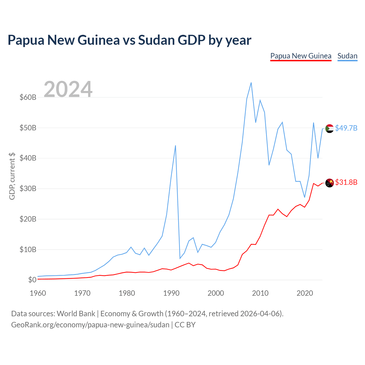 Papua New Guinea has a GDP of $31.8B compared to $49.7B for Sudan, ranking 110/197 and 94/197 by economy size, respectively.