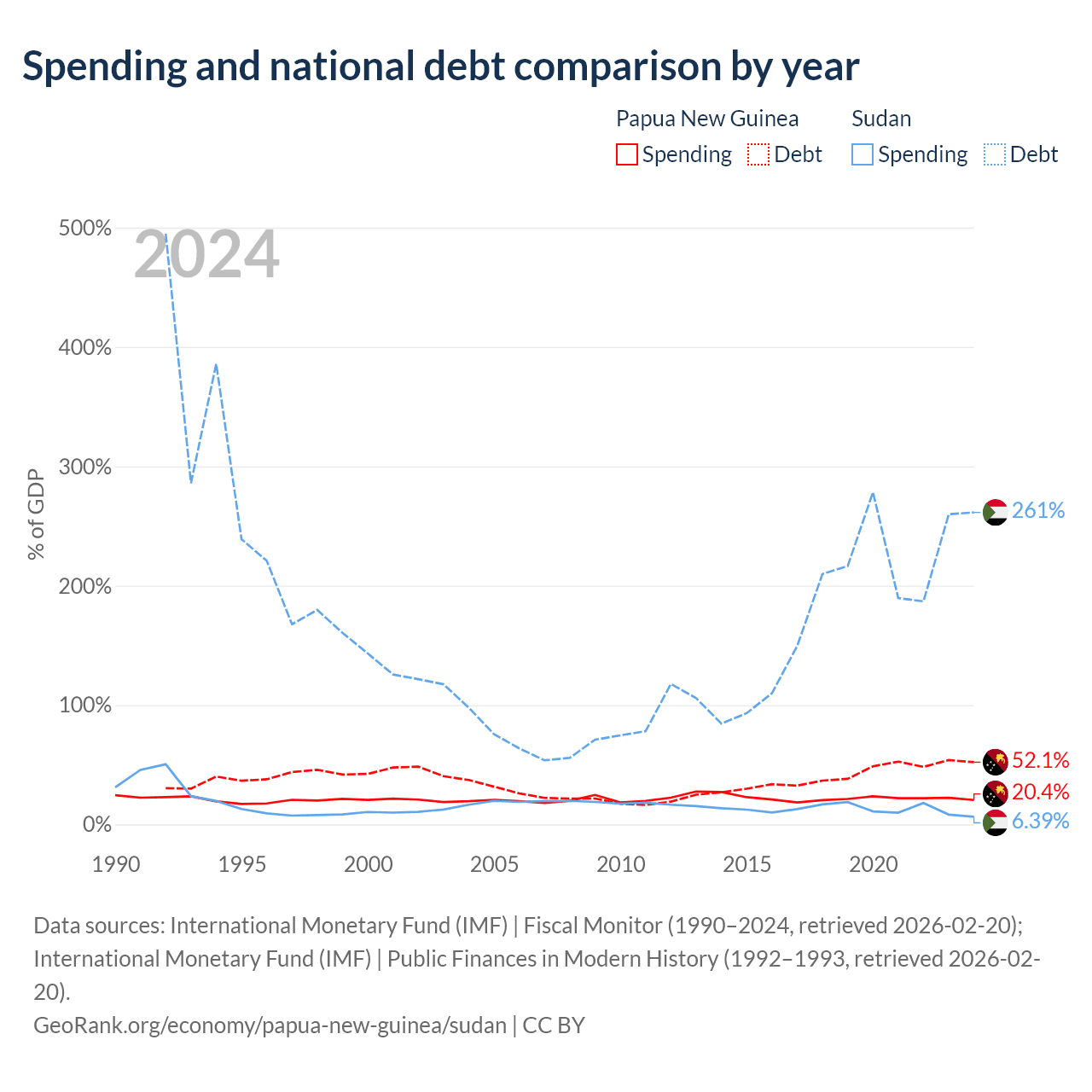 Papua New Guinea has $16.6B in government debt (52.1% of GDP), compared to $130B (261.4% of GDP) in Sudan.