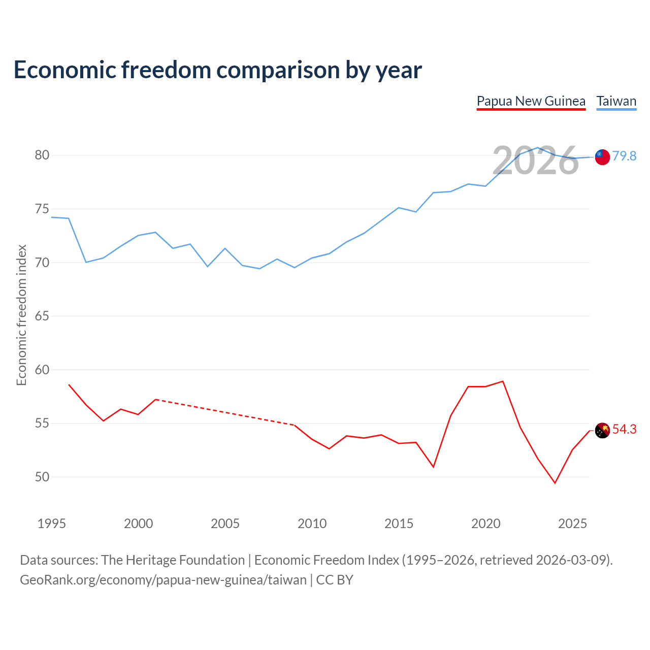 The Economic Freedom Index for Papua New Guinea is 54.3, ranking 134/197, compared to 79.8 for Taiwan, ranking 6/197. The chart above displays a comparison of annual changes in economic freedom indexes.