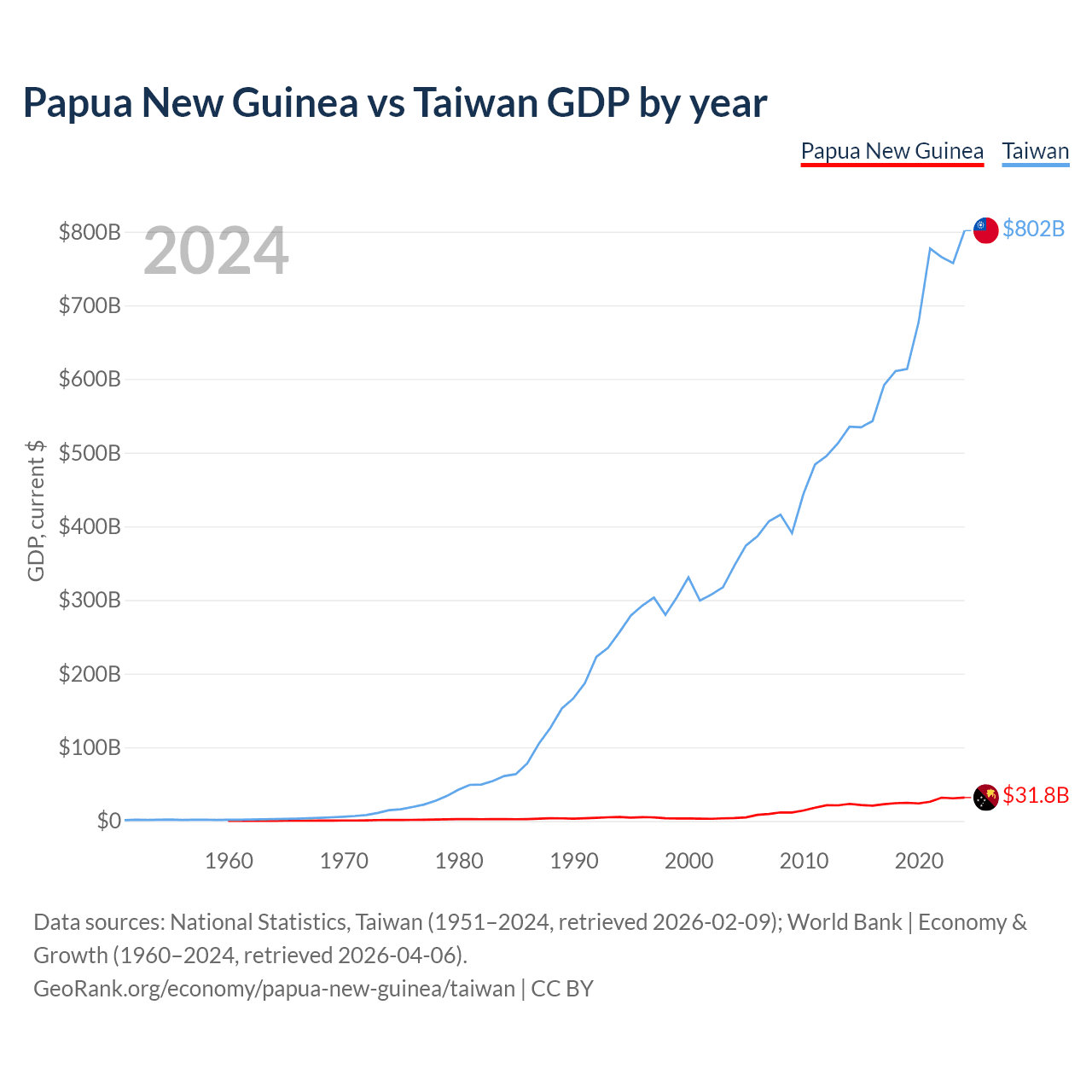 Papua New Guinea has a GDP of $31.8B compared to $802B for Taiwan, ranking 110/197 and 22/197 by economy size, respectively.