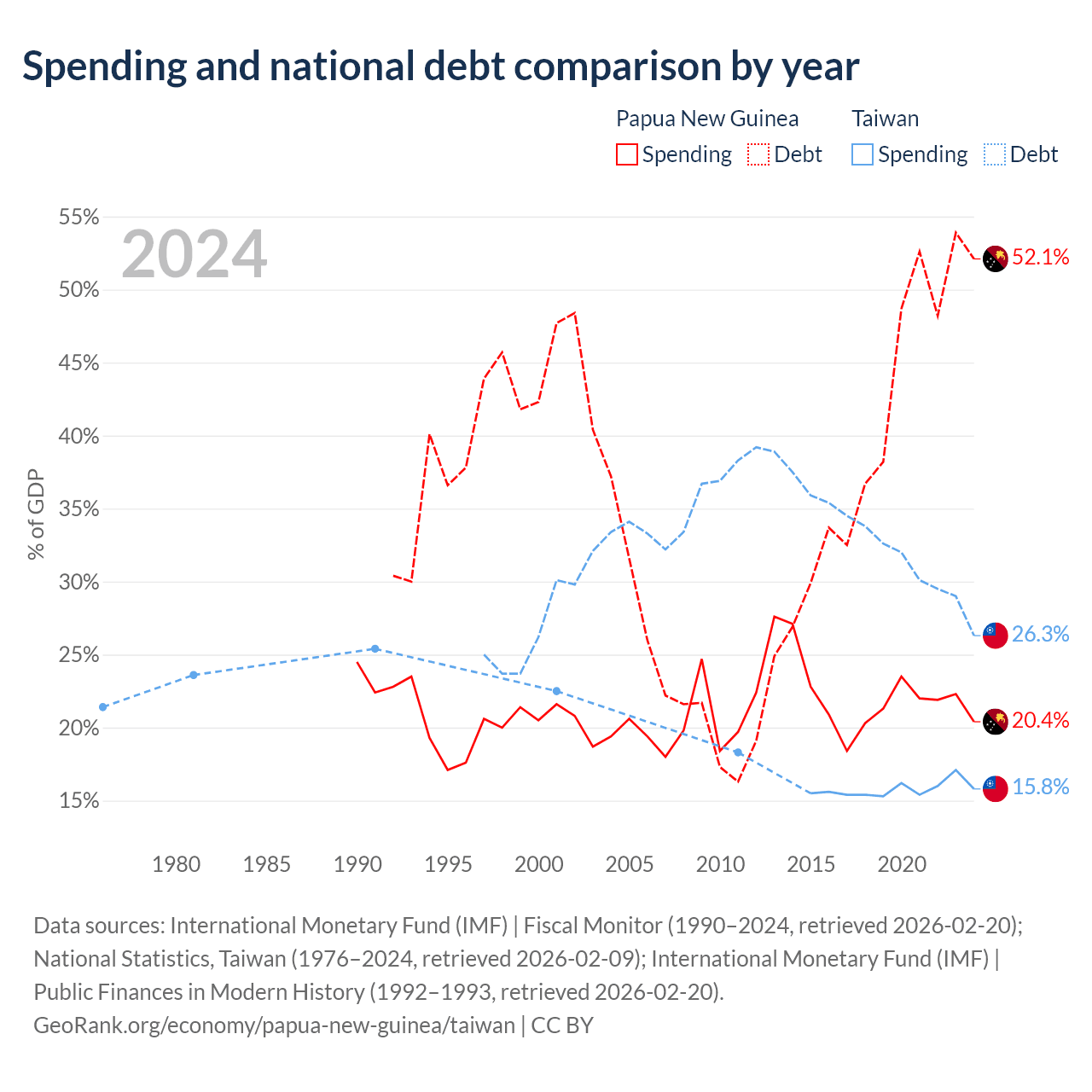 Papua New Guinea has $16.6B in government debt (52.1% of GDP), compared to $211B (26.3% of GDP) in Taiwan.