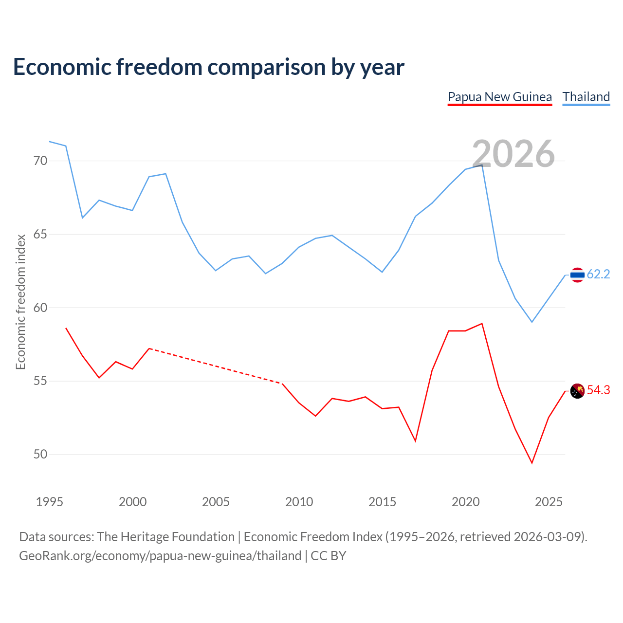 The Economic Freedom Index for Papua New Guinea is 54.3, ranking 134/197, compared to 62.2 for Thailand, ranking 88/197. The chart above displays a comparison of annual changes in economic freedom indexes.