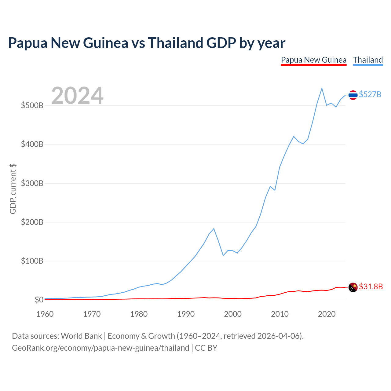 Papua New Guinea has a GDP of $31.8B compared to $527B for Thailand, ranking 110/197 and 31/197 by economy size, respectively.
