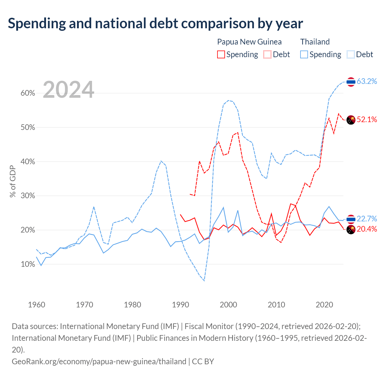 Papua New Guinea has $16.6B in government debt (52.1% of GDP), compared to $333B (63.2% of GDP) in Thailand.