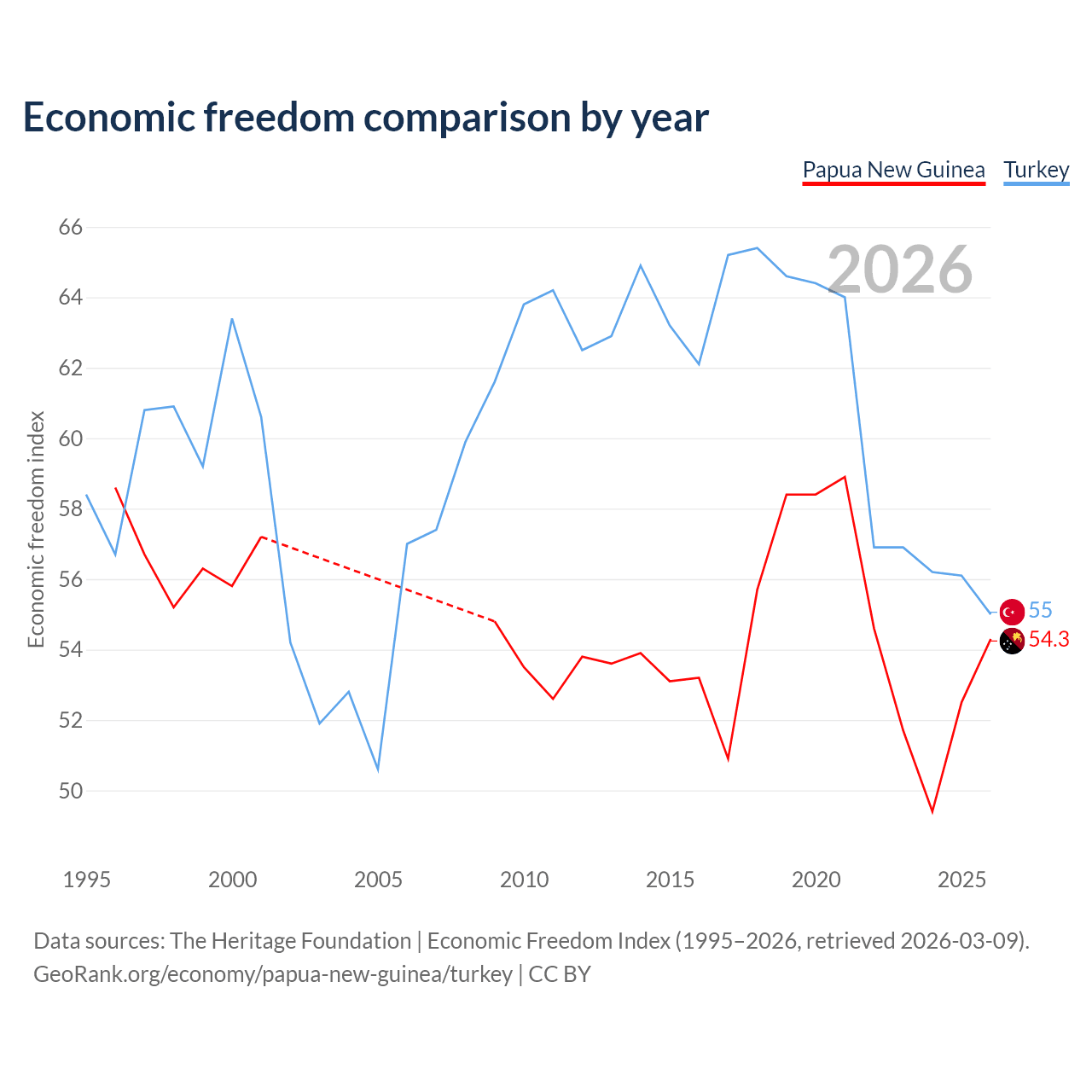 The Economic Freedom Index for Papua New Guinea is 54.3, ranking 134/197, compared to 55 for Turkey, ranking 129/197. The chart above displays a comparison of annual changes in economic freedom indexes.