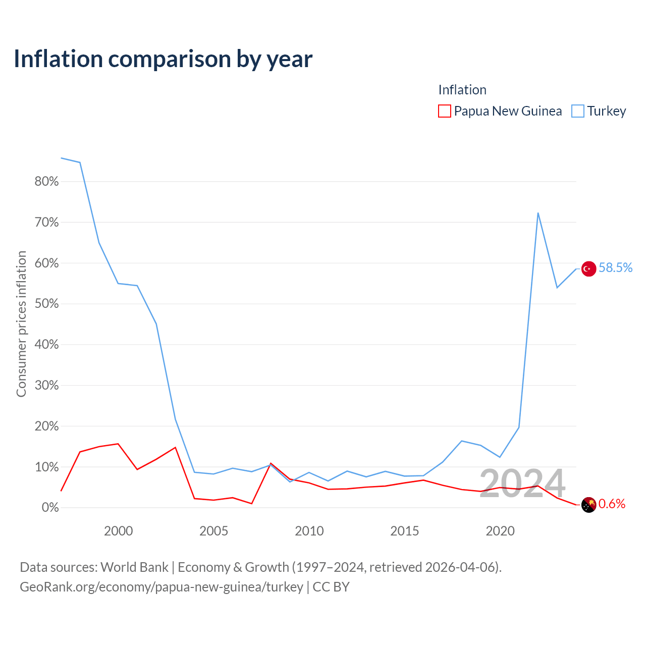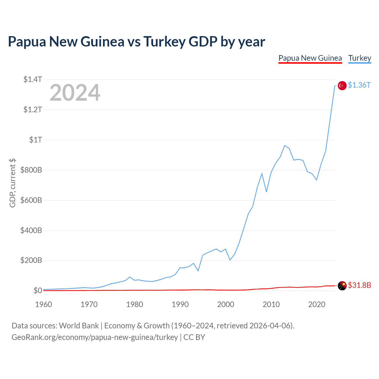 Papua New Guinea has a GDP of $31.8B compared to $1.36T for Turkey, ranking 110/197 and 17/197 by economy size, respectively.