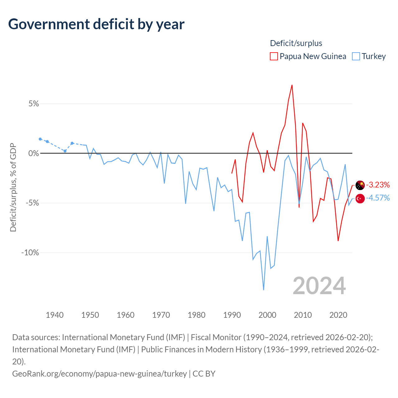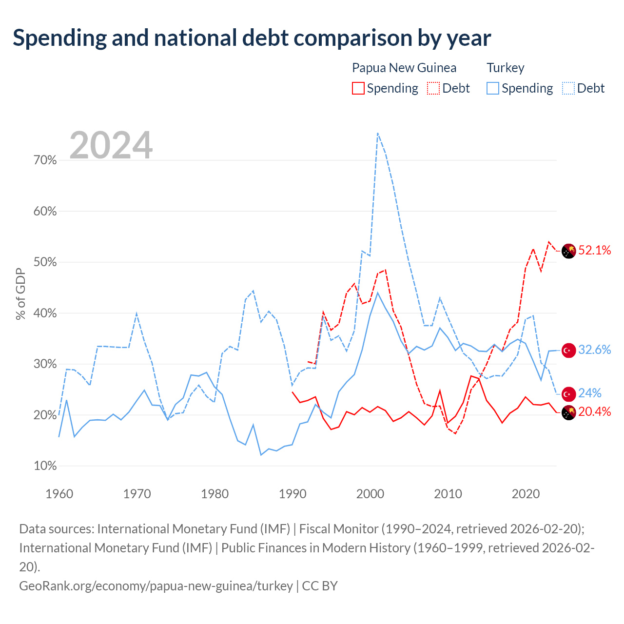 Papua New Guinea has $16.6B in government debt (52.1% of GDP), compared to $327B (24% of GDP) in Turkey.