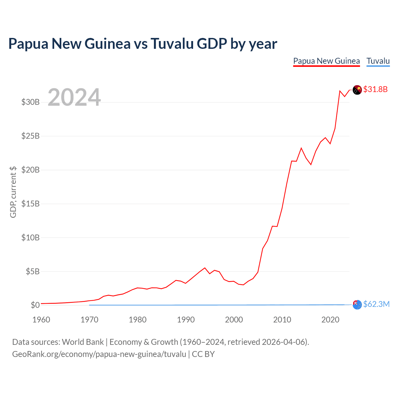 Papua New Guinea has a GDP of $31.8B compared to $62.3M for Tuvalu, ranking 110/197 and 196/197 by economy size, respectively.