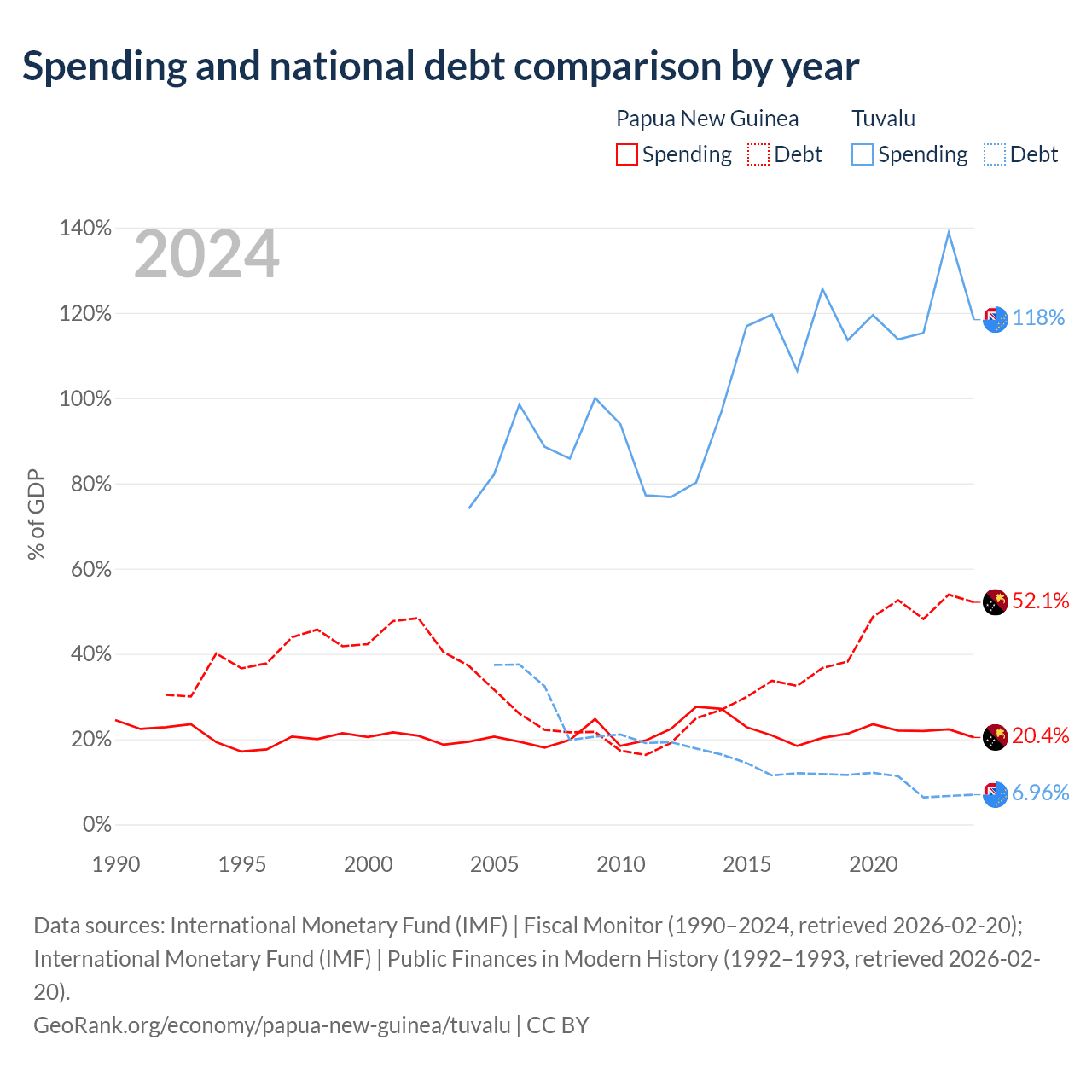 Papua New Guinea has $16.6B in government debt (52.1% of GDP), compared to $4.15M (6.96% of GDP) in Tuvalu.