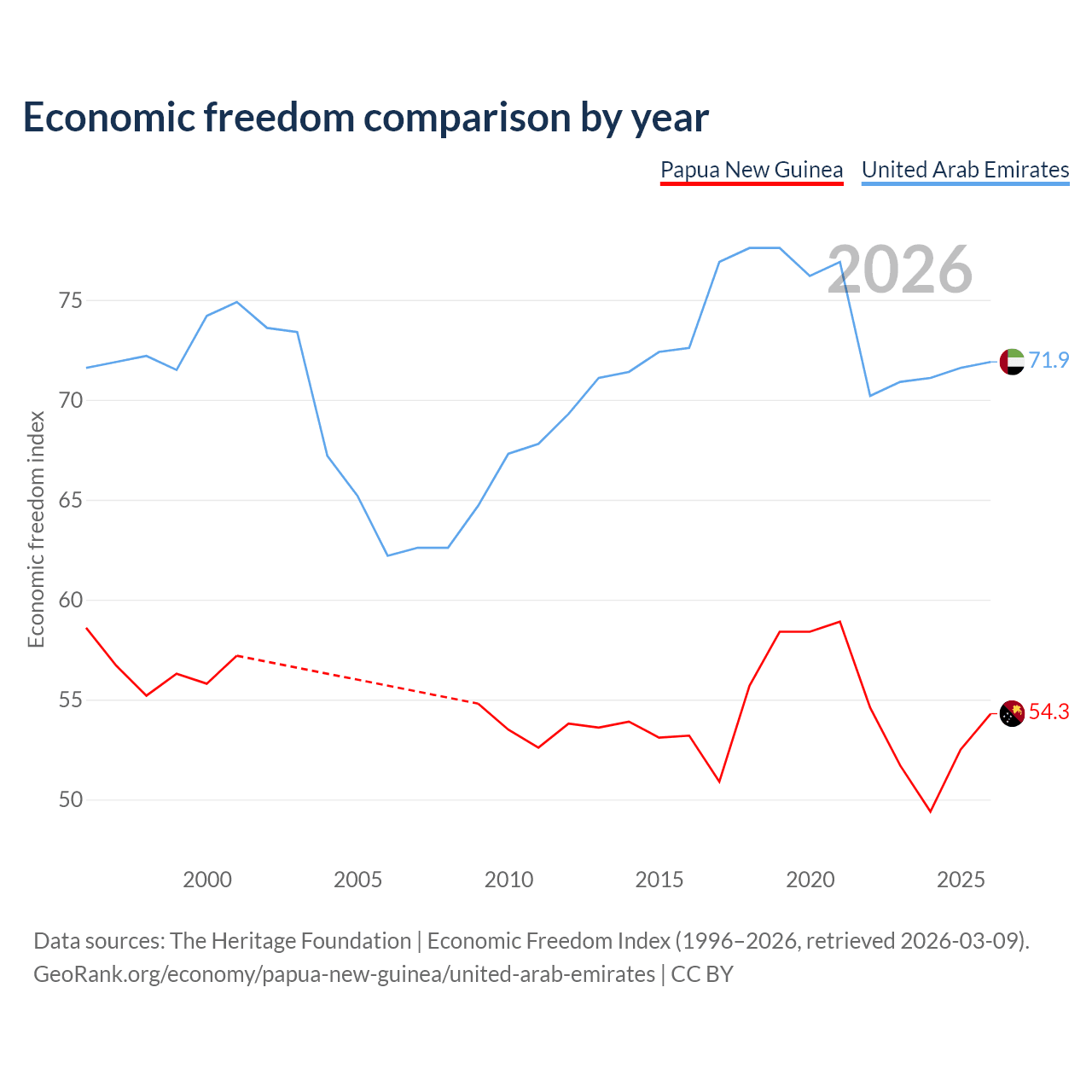 The Economic Freedom Index for Papua New Guinea is 54.3, ranking 134/197, compared to 71.9 for the United Arab Emirates, ranking 29/197. The chart above displays a comparison of annual changes in economic freedom indexes.