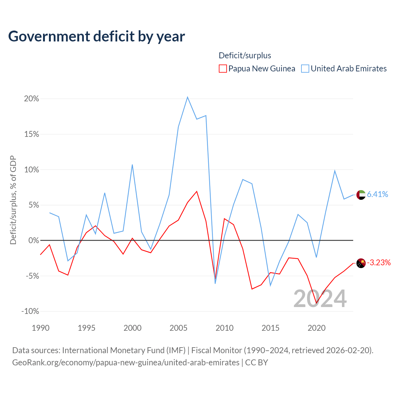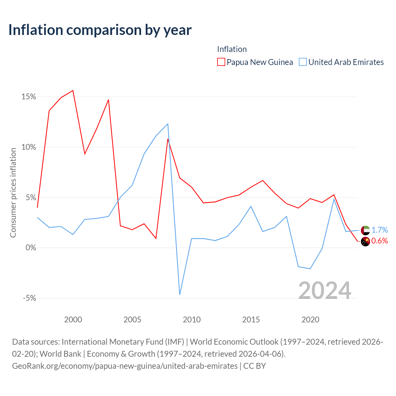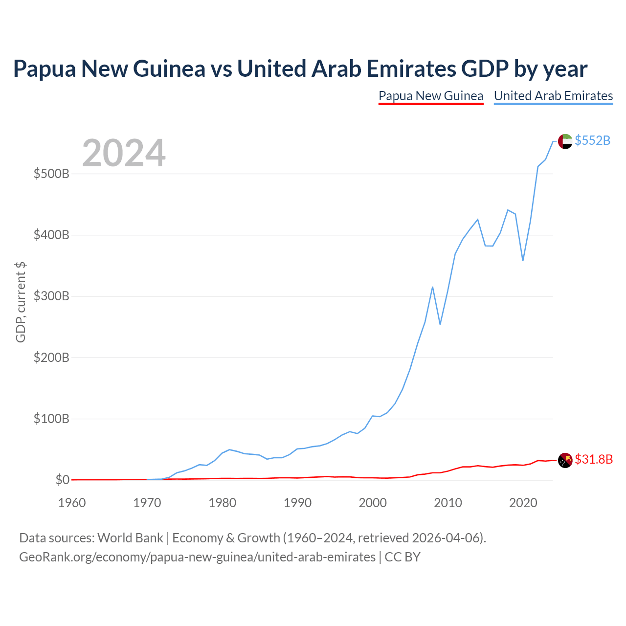 Papua New Guinea has a GDP of $31.8B compared to $552B for the United Arab Emirates, ranking 110/197 and 27/197 by economy size, respectively.