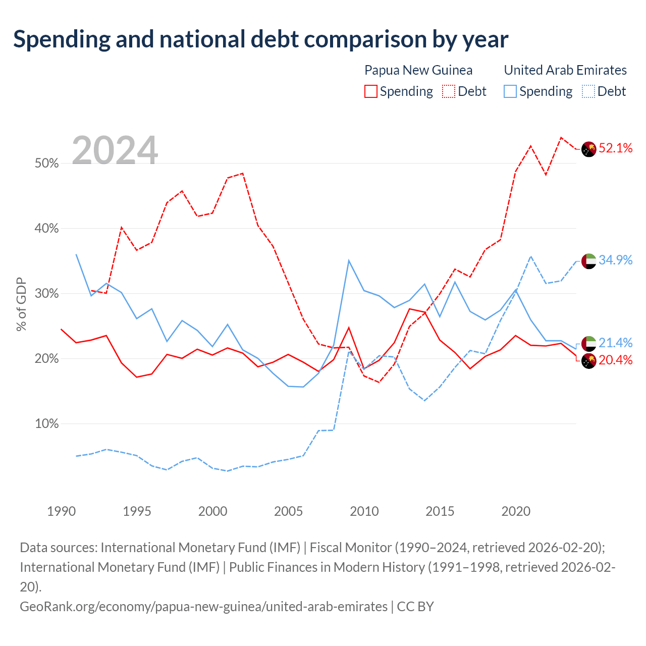 Papua New Guinea has $16.6B in government debt (52.1% of GDP), compared to $193B (34.9% of GDP) in the United Arab Emirates.