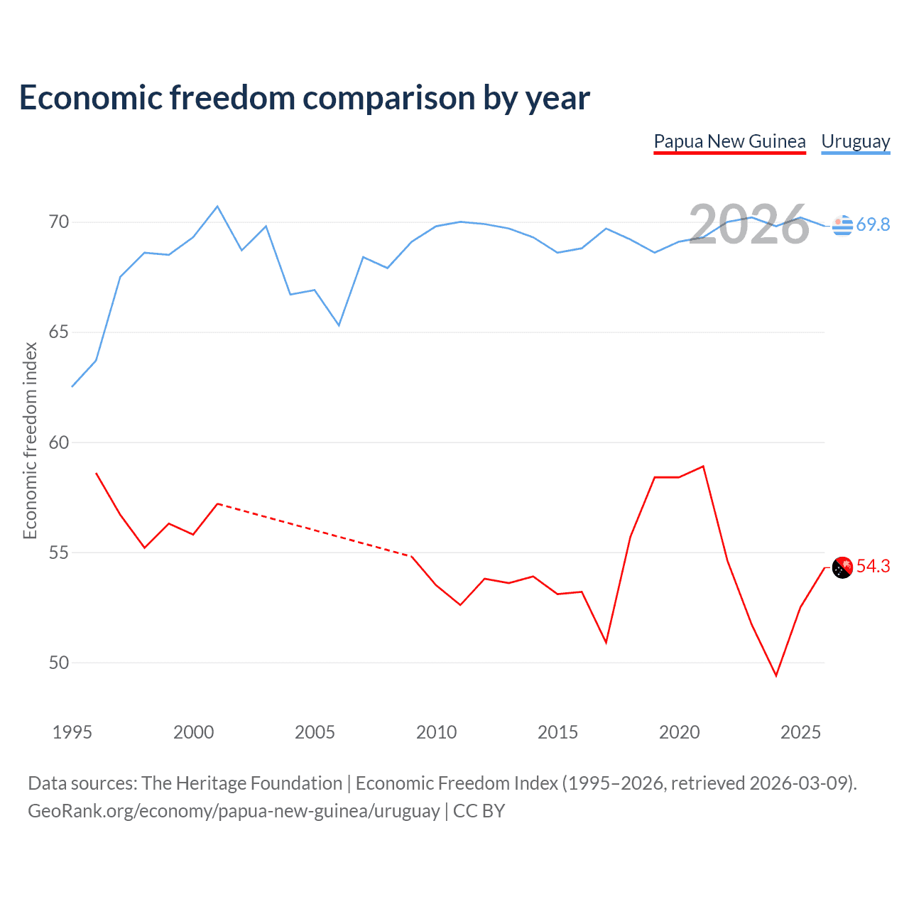 The Economic Freedom Index for Papua New Guinea is 54.3, ranking 134/197, compared to 69.8 for Uruguay, ranking 39/197. The chart above displays a comparison of annual changes in economic freedom indexes.