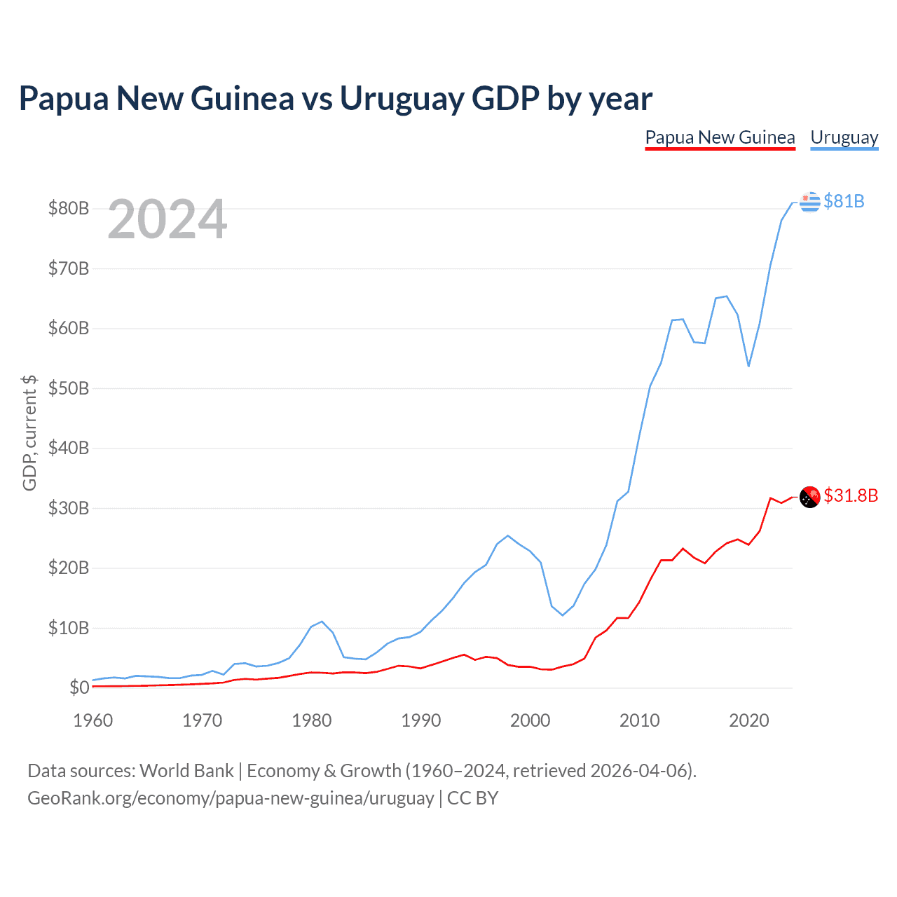 Papua New Guinea has a GDP of $31.8B compared to $81B for Uruguay, ranking 110/197 and 81/197 by economy size, respectively.